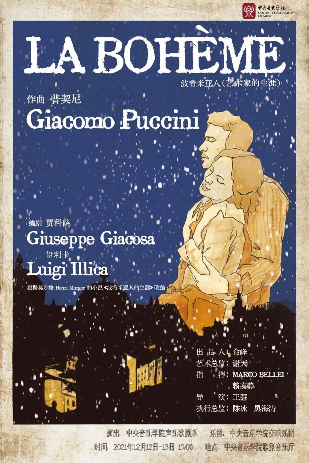 四幕歌剧《波希米亚人》(La Bohème)是意大利作曲家贾科莫·普契尼(Giacomo Puccini 1858-1924)的传世名作,被誉为普契尼12部歌剧中最为精彩的作品之一。该剧又名《艺术家的生涯》、《绣花女》,取材于法国亨利·谬尔杰的小说《穷艺术家的生活情景》,意大利人裘塞佩·贾科萨、路易基·伊利卡作词。1896年2月1日,托斯卡尼尼指挥首演于意大利都灵。