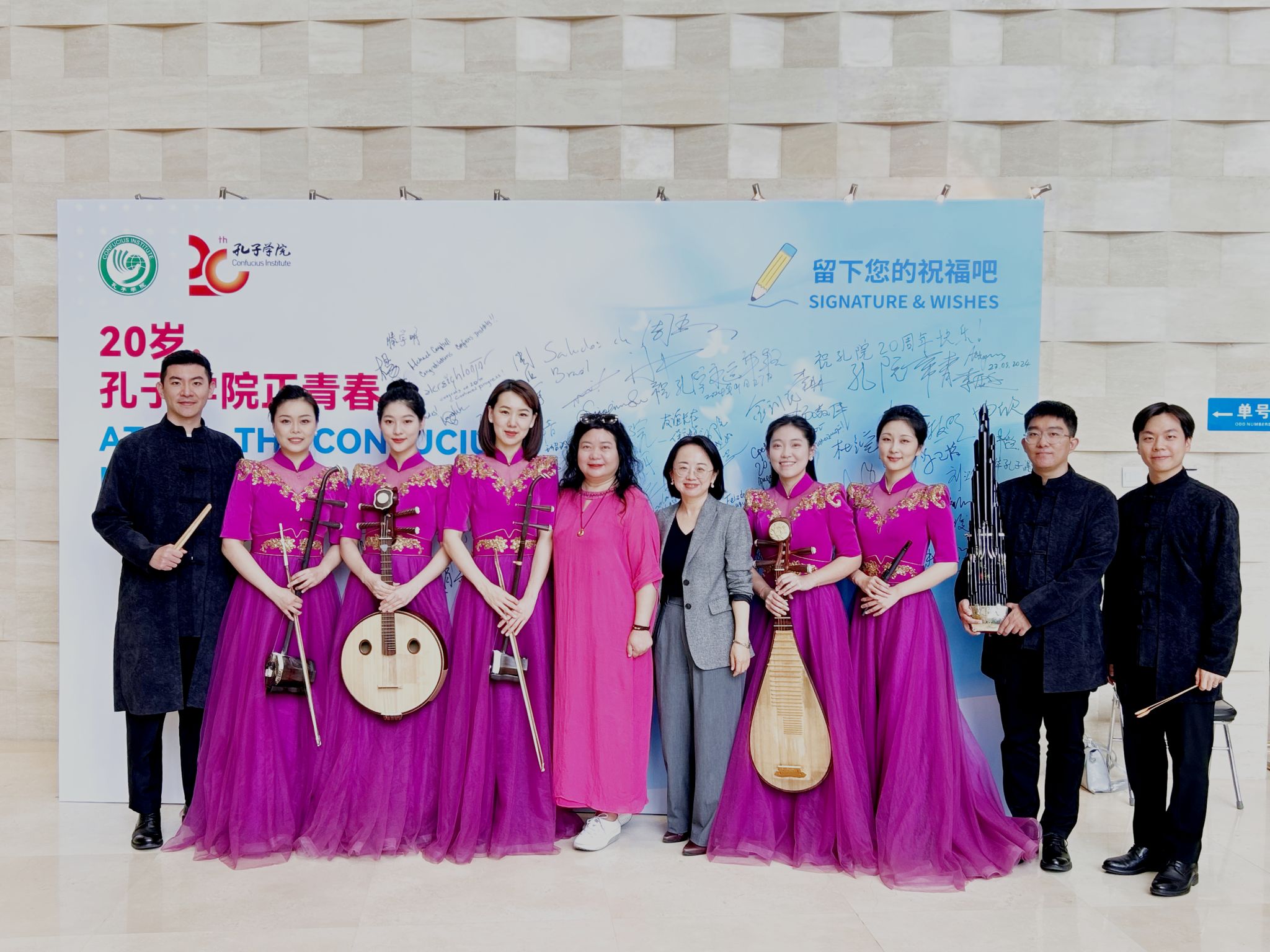 《茉莉花》是中外文化交流互鉴的象征,乐曲通过多样的改编手法展现了民族音乐与时俱进、充满活力的青春气息,同时也巧妙呼应了“20岁,孔子学院正青春”的活动主题。乐团精湛的演奏技巧、热情洋溢的艺术表达,使乐曲更加动人心弦,赢得了现场中外嘉宾的热烈掌声。