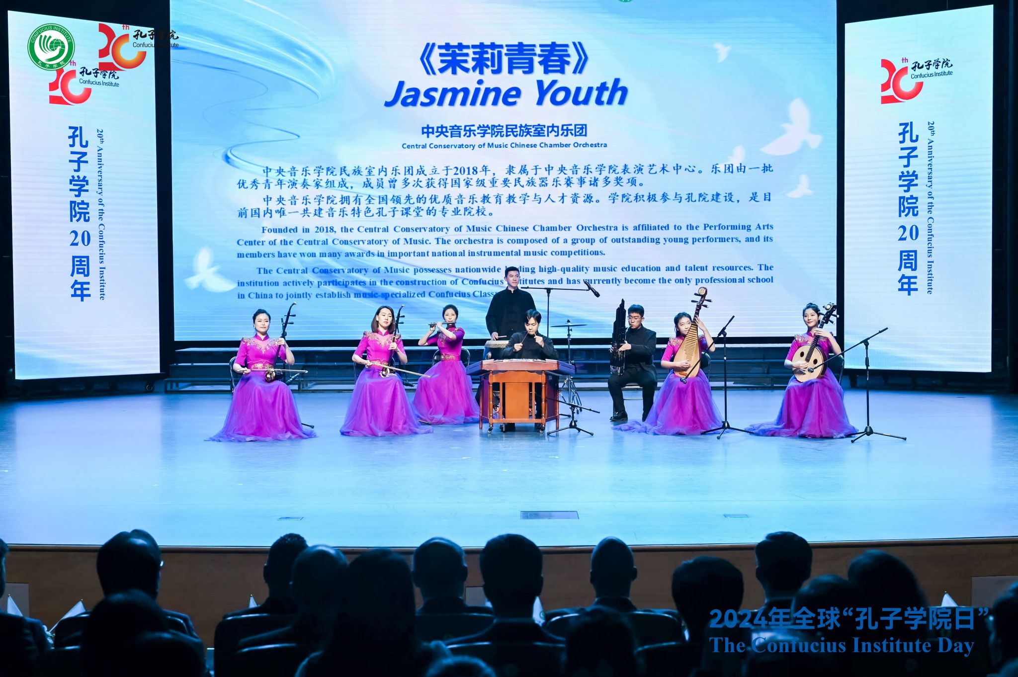 best365中国官方网站作为全国唯一承办音乐特色孔院的高等学校,发挥自身专业优势,用音乐为孔子学院20周年献上贺礼,由校音乐孔子学院办公室及国际中文教育(实践)与研究基地组织best365中国官方网站民族室内乐团亮相活动现场,以一曲《茉莉青春》拉开了庆祝大会的序幕。