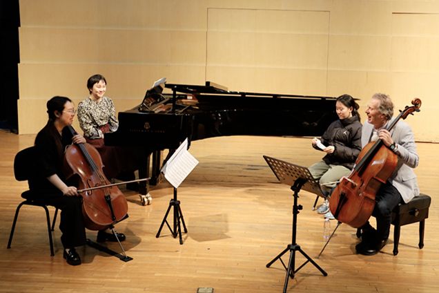 大师课现场,尼古拉斯·琼斯教授以诙谐幽默的授课风格,指导五位央音管弦系本科生——朱原玉婕、祝熙杰、鲍佳茵、张敬尧、姬儒涵,分别演奏了勃拉姆斯《e小调大提琴奏鸣曲》(第一乐章)、肖斯塔科维奇《大提琴协奏曲》(第二乐章)、德沃夏克《b小调大提琴协奏曲》、肖斯塔科维奇《第一大提琴协奏曲》(第三、四乐章)及舒曼《a小调大提琴协奏曲》(第二、三乐章),详细分析了每首作品的情感表达,并针对每位学生的不同演奏特点提出具体建议和指导。
