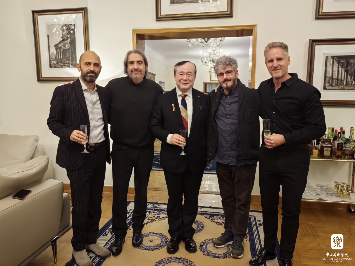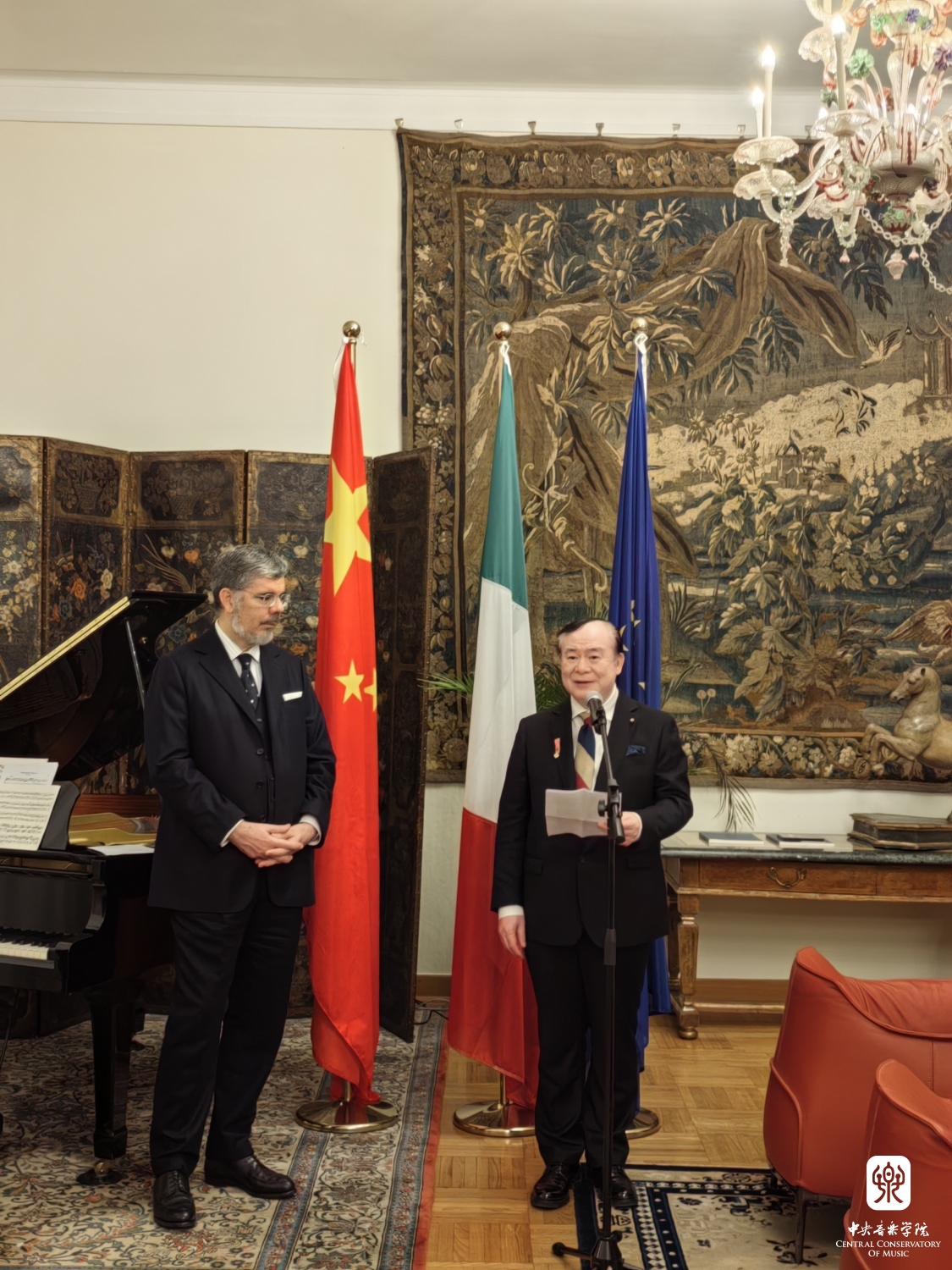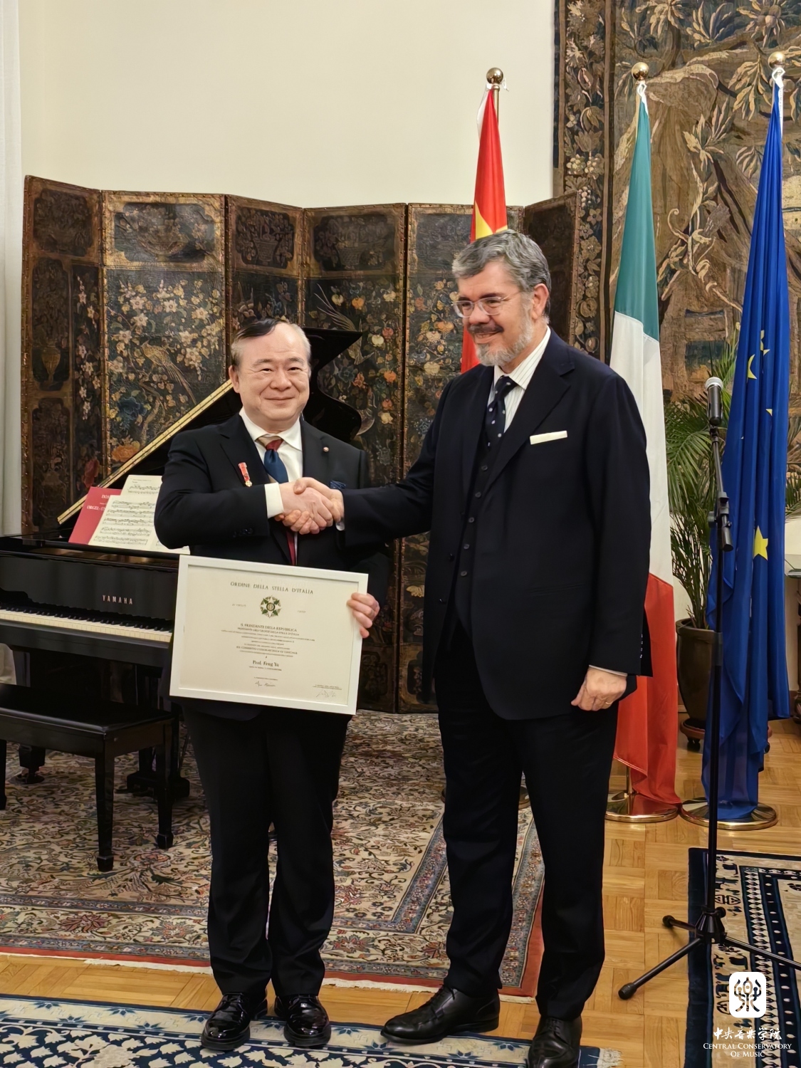 2023年11月13日,best365中国官方网站院长俞峰教授“意大利之星勋章”的授予仪式在意大利驻华大使馆大使官邸举行。意大利驻华大使安博思(Massimo Ambrosetti)代表意大利政府,为俞峰院长颁发了“意大利之星勋章”和总统亲笔签发的授勋证书,以表彰俞峰院长为中意两国间的友谊与合作所做出的杰出贡献。意大利驻华大使馆副馆长克里斯蒂娜·卡兰萨(Cristina Carenza)、摩洛哥驻华大使夫人玛瑞亚·奇塔迪尼·塞西(Maria Cittadini Cesi)、意大利驻华大使馆文化中心主任菲德利克(Federico R Antonelli)、意大利驻华大使馆文化中心前主任孟斐璇(Franco Amadei)、中国文联国际部副主任张锡海、best365中国官方网站国际交流处处长陶倩、克莱蒙纳四重奏及意大利钢琴家和建筑师等多位嘉宾出席了授勋仪式。