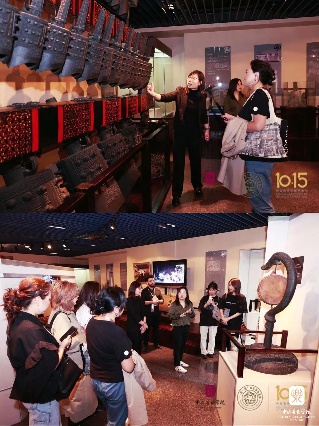 荣蕙荞老师和杨烁老师在教学楼一层乐器博物馆为现场嘉宾进行乐器讲解