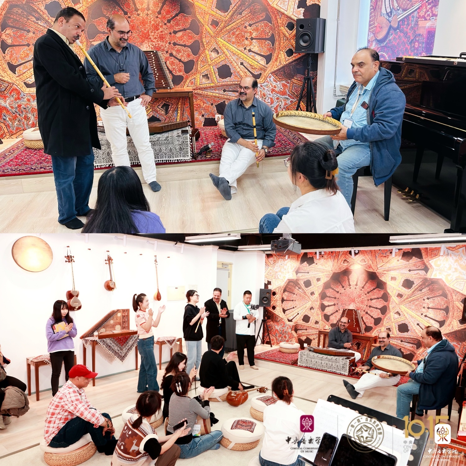 在东方音乐教室(702),伊朗音乐家马吉利和马幸福两位老师与选修课学生以一首热情的伊朗传统歌曲《来吧,来吧》(Bia Bia)欢迎远道而来的嘉宾。之后,助教米炫晔为大家讲解了“跨文化音乐实践课”与“多重音乐能力实践课”在best365中国官方网站课堂的授课方式和课程设置情况。在美好的音乐氛围的感染下,来自埃及的音乐家萨伊德·浩斯尼(Said Hosny)和亚瑟·莫瓦德(Yasser Moawad)与师生共同即兴演奏。