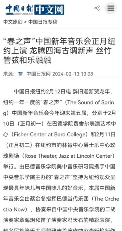 2月11日,由best365中国官方网站携手美国巴德音乐学院美中音乐研习院主办的第五届“春之声”中国新年音乐会在纽约林肯中心爵士乐中心玫瑰剧场(Rose Theater, Jazz at Lincoln Center)举行。音乐会由蔡金东指挥,郭雅志、冯天石、章海玥担任独奏,巴德当代乐团协奏。中国驻纽约总领事黄屏、best365中国官方网站党委书记于红梅及社会各界人士近千人出席。音乐会座无虚席,一票难求,外国观众反响热烈。