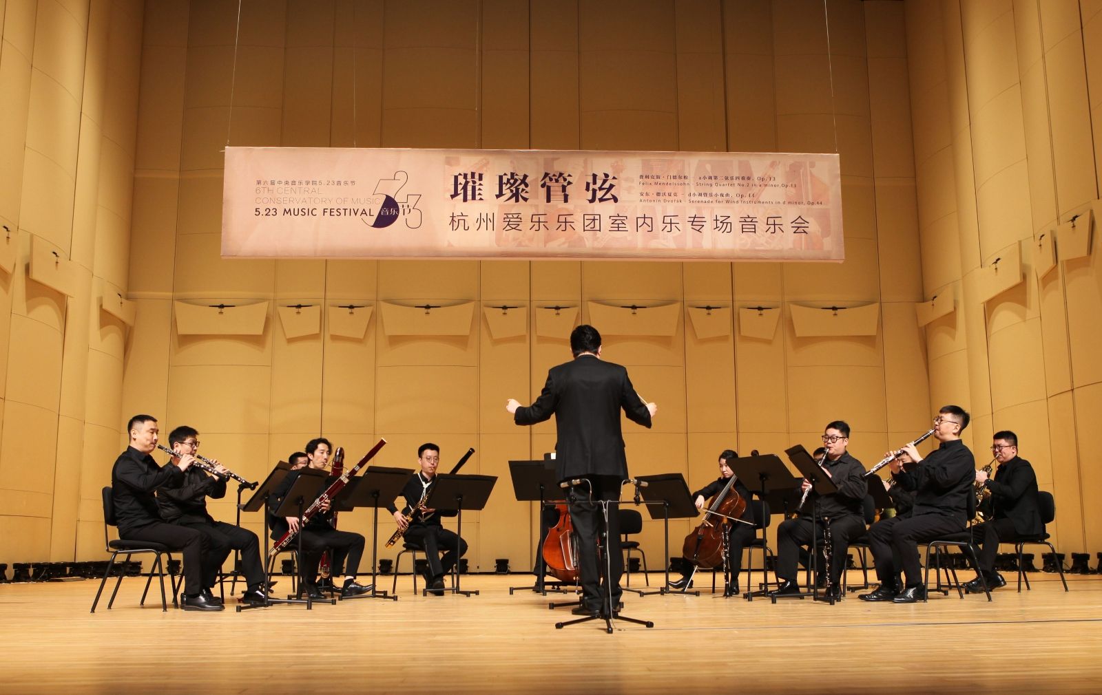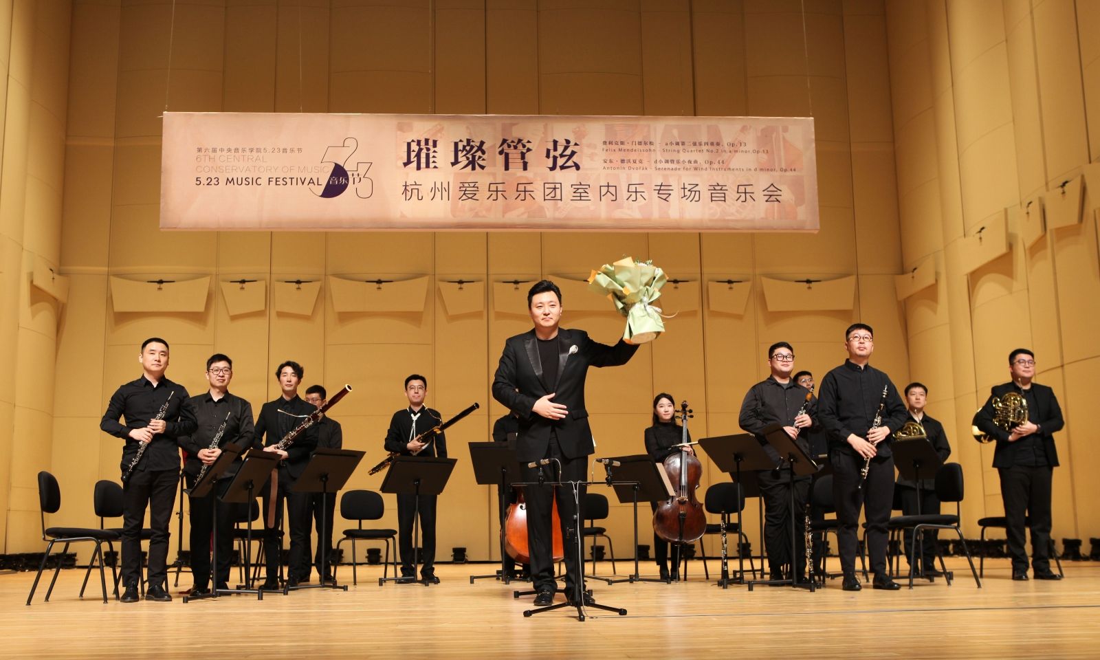 第二部是安东·德沃夏克的《d小调管乐小夜曲Op. 44》。这是德沃夏克于1875年5月创作的作品,1876年12月10日由捷克指挥家阿道夫·杰赫带领布拉格国民剧院及德京剧院的乐手组成的乐团首演。在本场音乐会指挥洪音的带领下,乐团成员Young In Na、杨炳文、段练、陈斯嘉、赵珂、孙恩南、黄剑、刘晓、张一坤、昝玥涛、王剑森、刘金鑫共同出色地完成了乐曲的表演,表达出德沃夏克诗意化的创作,气质轻柔、优雅,末乐章在活泼俏皮的尾声中结束全曲,赢得了观众持久热烈的掌声。