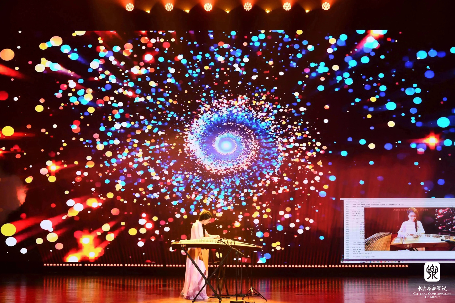 接下来,李小兵教授向观众介绍了亲临现场的本场音乐会AI技术总监管晓宏院士,以及他在音乐与幂律关系方面的研究成果,还有下一步将要和王小勤教授联合研究的目标。通过幂律的话题,引出了下一首作品——赵艺璇作曲的Drizzle Path(为机器听觉、AI生成视觉与钢琴而作)。其中声音部分采用了机器听觉技术,通过实时提取钢琴演奏家的演奏参数,包括音高、泛音、速度、响度等,利用随机算法实时合成新声音,并在建构的三维空间中与演奏家共同呈现。视觉部分采用了AIGC(人工智能创作内容)领域的理念,以“文生图(text to image)”为主线,利用AI演算出序列帧,并将演算速度与钢琴家演奏速度同步。作品的声音表达与视觉表达都与演奏家的实时演奏紧密相关,既呼应了钢琴家演奏的音乐表情,也呈现了音乐与AI的深度对话。