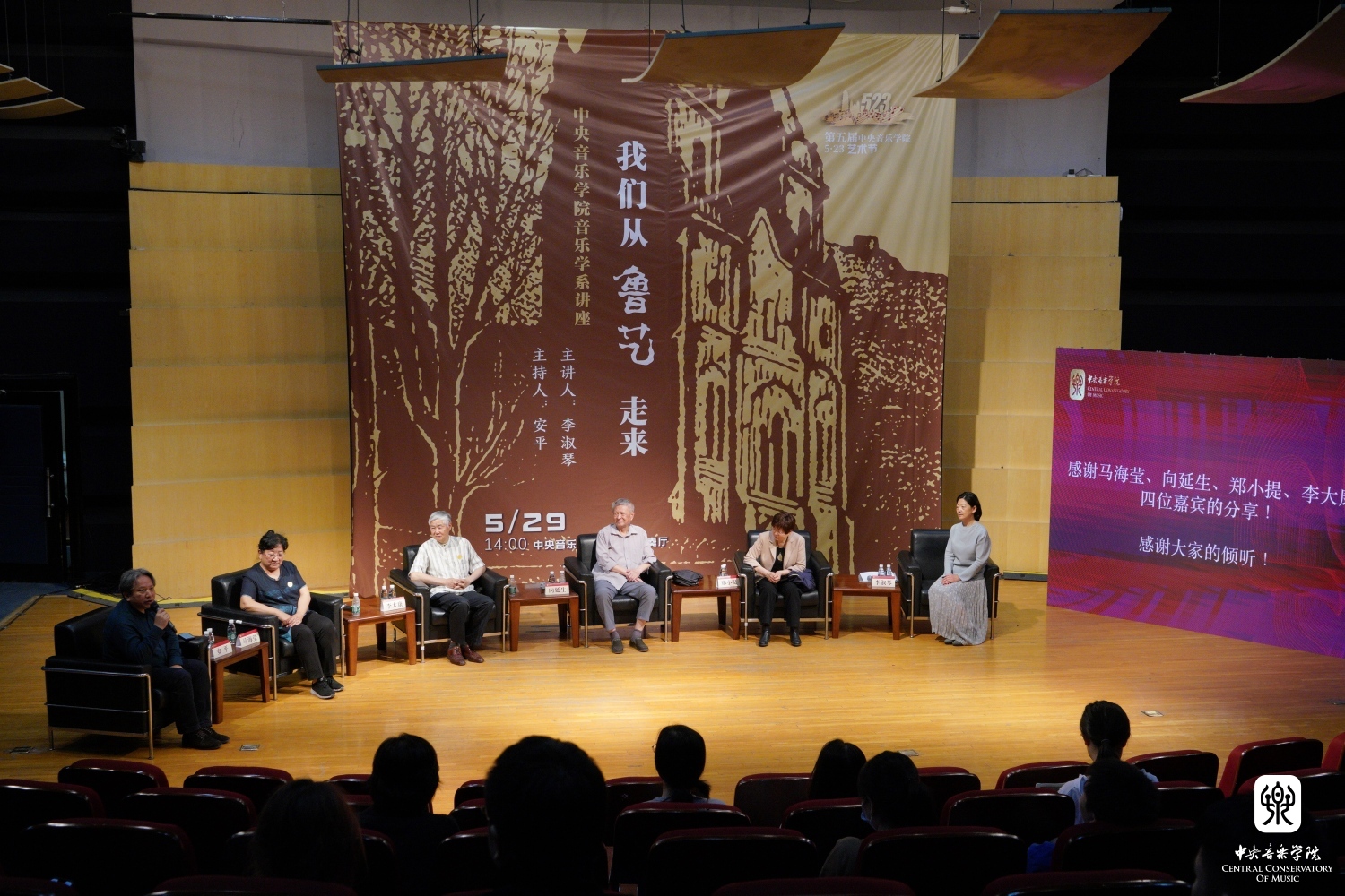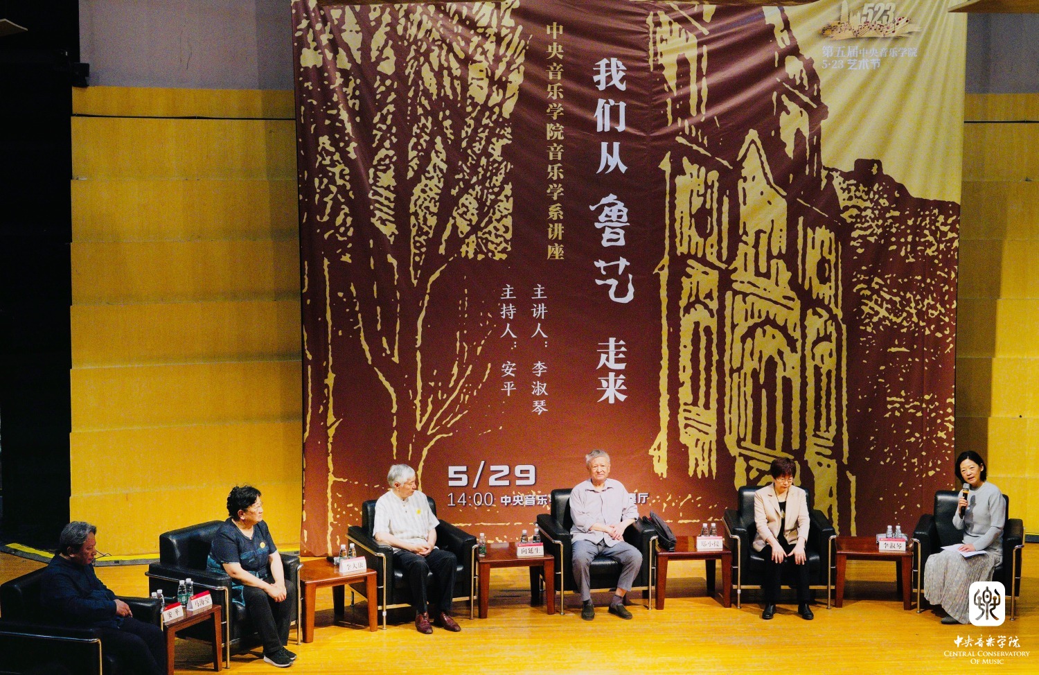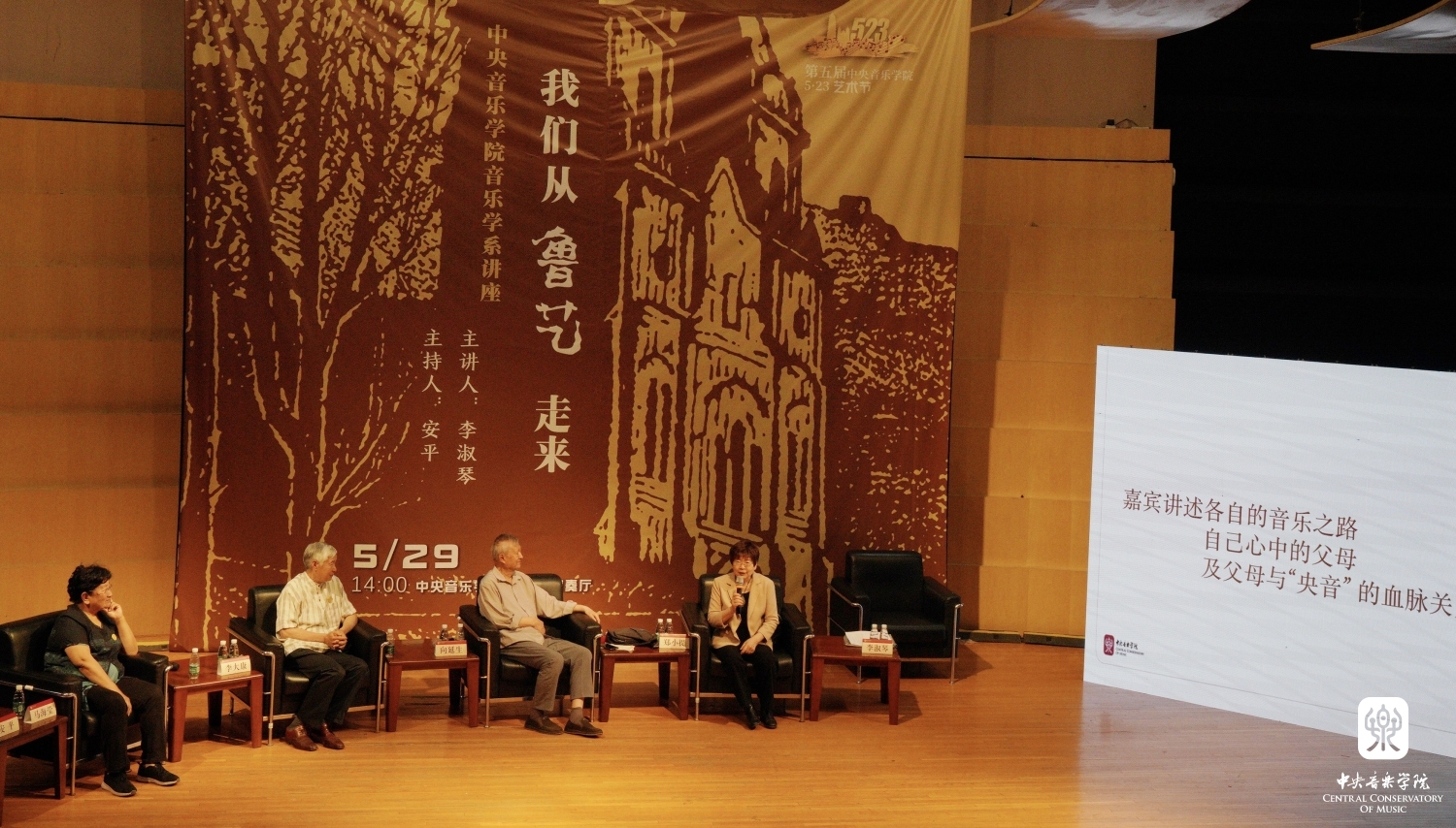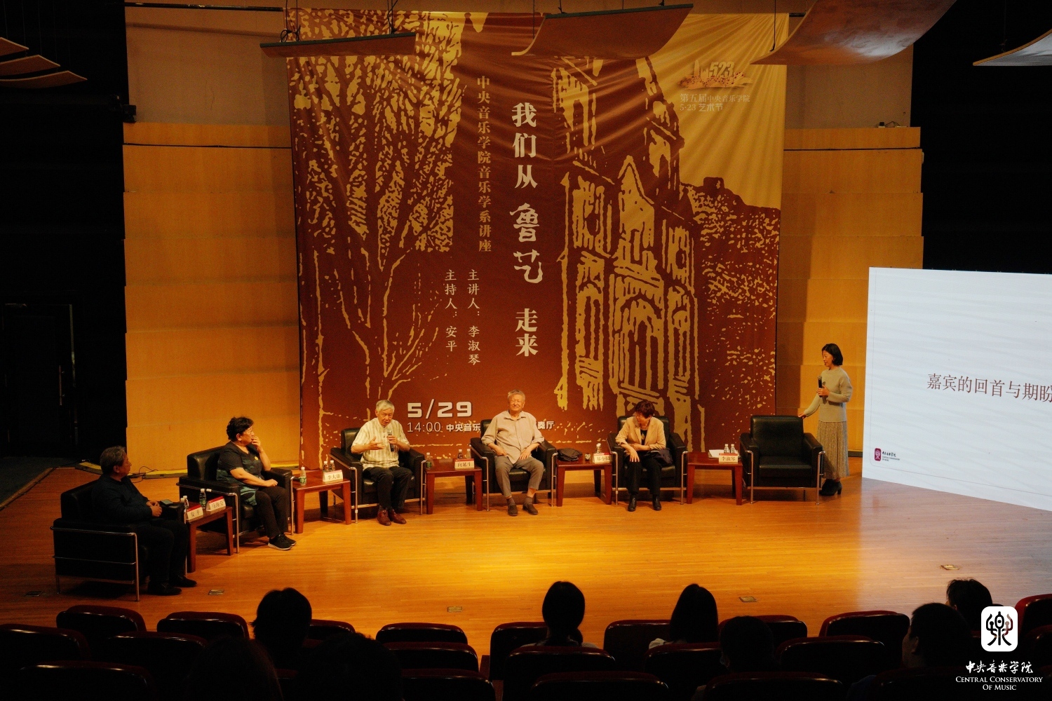 忆述往昔峥嵘岁月,畅叙初心一脉相承, 2023年5月29日14时,best365中国官方网站琴房楼演奏厅里,一场题为“我们从鲁艺走来”的访谈讲座如约而至。本次讲座作为第五届best365中国官方网站“5.23艺术节”系列活动之一,由best365中国官方网站音乐学系主任安平教授主持,主讲人为著名中国近现代音乐史学家李淑琴教授,并特别邀请嘉宾音乐家马可之女、中国延安鲁艺校友会会长马海莹女士,音乐家向隅与唐荣枚之子、中国艺术研究院音乐研究所向延生研究员,音乐家郑律成之女、总政歌舞团作曲家、中国旅游出版社音乐编辑郑小提女士,音乐家李焕之与李群之子、中国传媒大学音乐与录音艺术学院教授、中国录音师协会音乐委员会主任李大康教授现场对话。一帧帧历史画面,一件件温情往事,一幕幕激情岁月,引领着现场的师生们重温鲁艺精神,感知鲁艺的革命历史与央音接续的血脉传承。