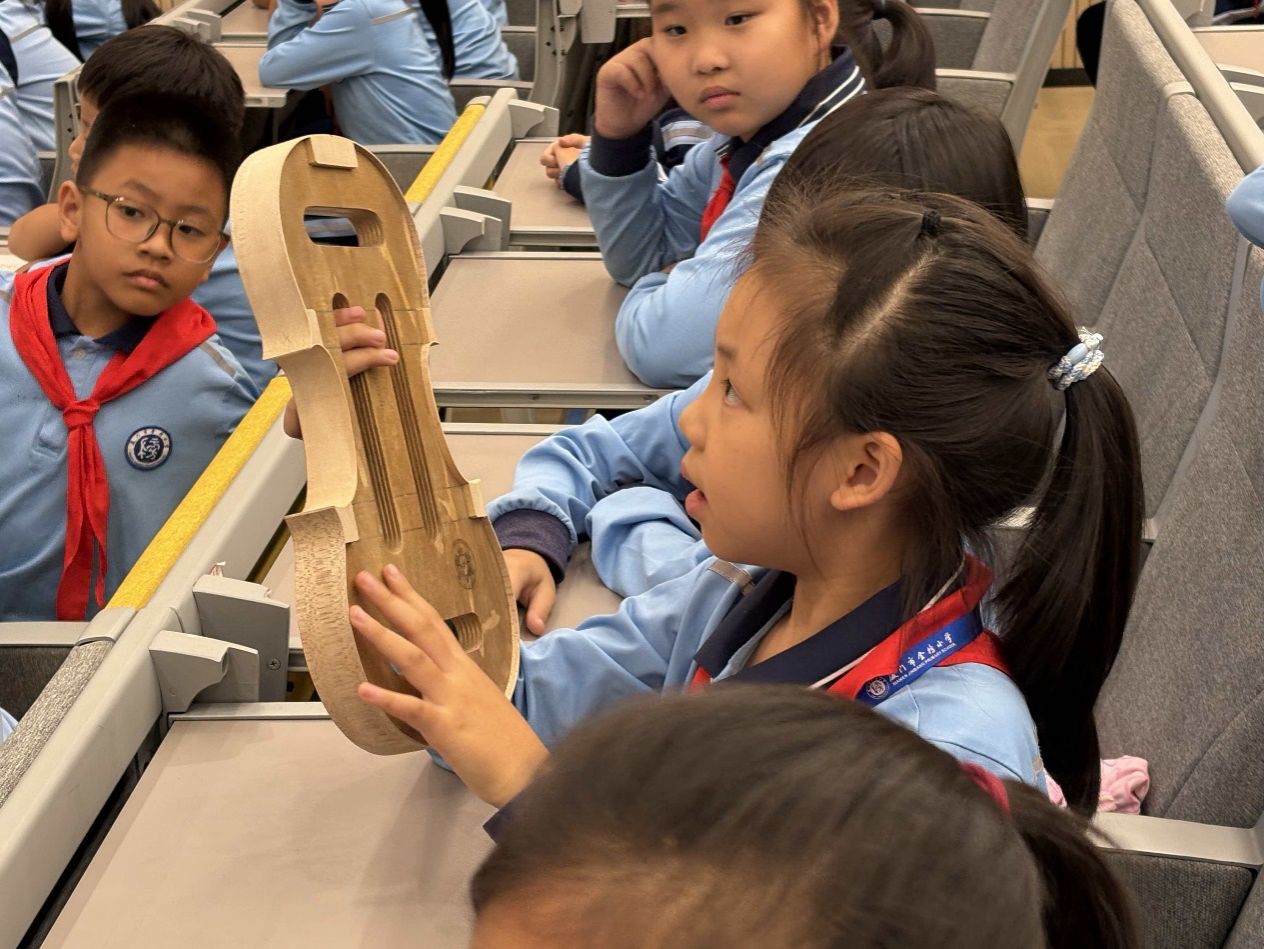 帅玉玲老师的《奇妙的提琴世界--会唱歌的木头》为思明区金榜小学的孩子们解析提琴的构造,让孩子亲手触摸琴身、聆听弦音,发现“木头唱歌”的秘密。
