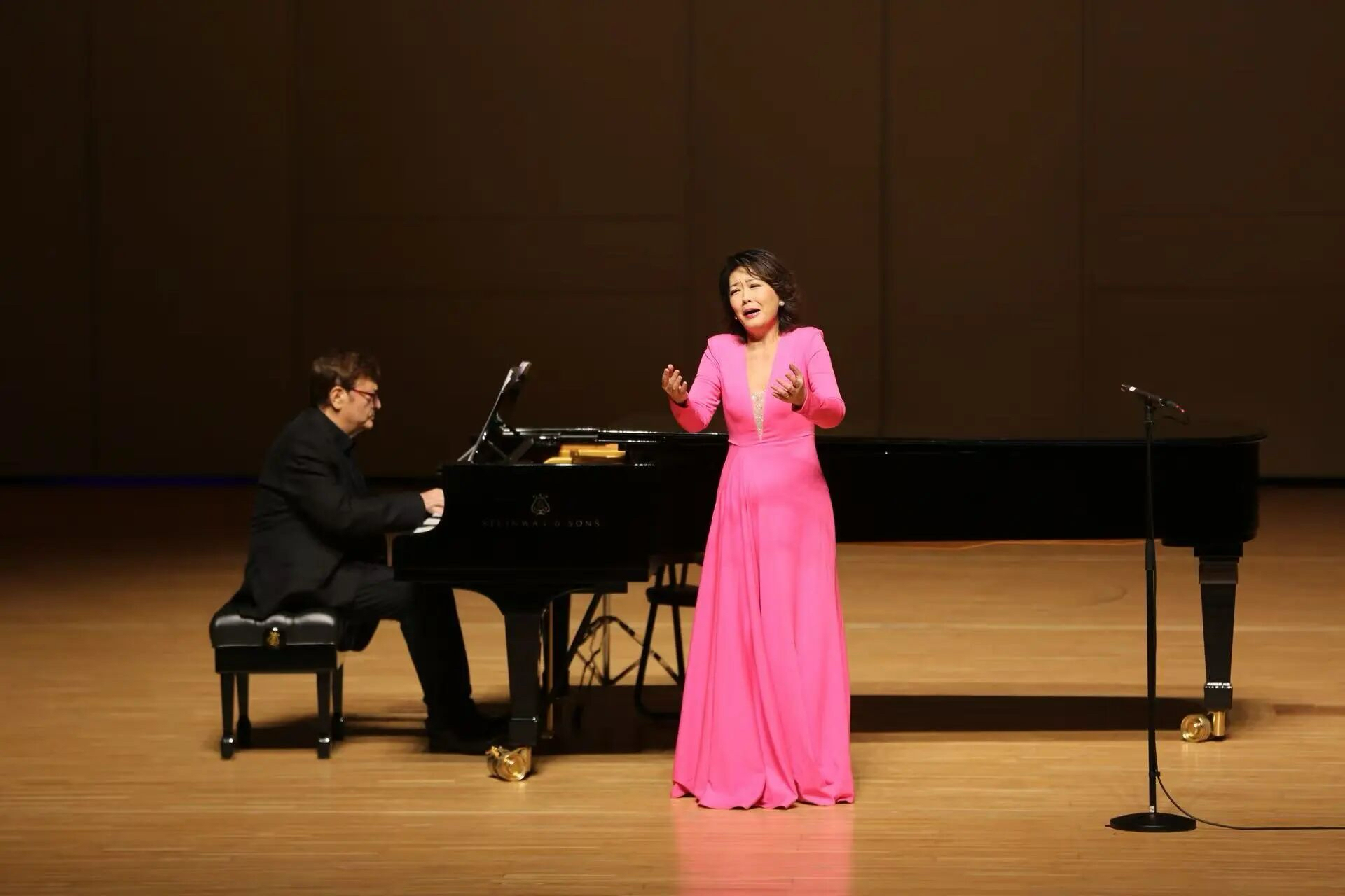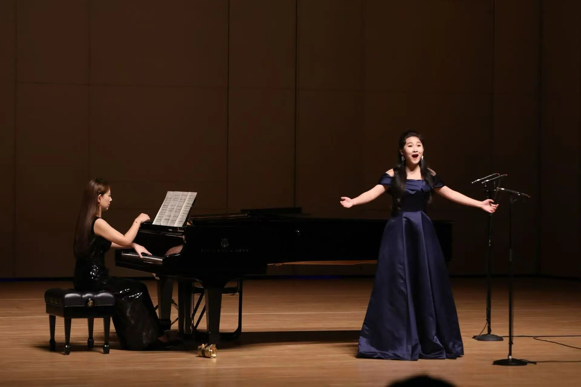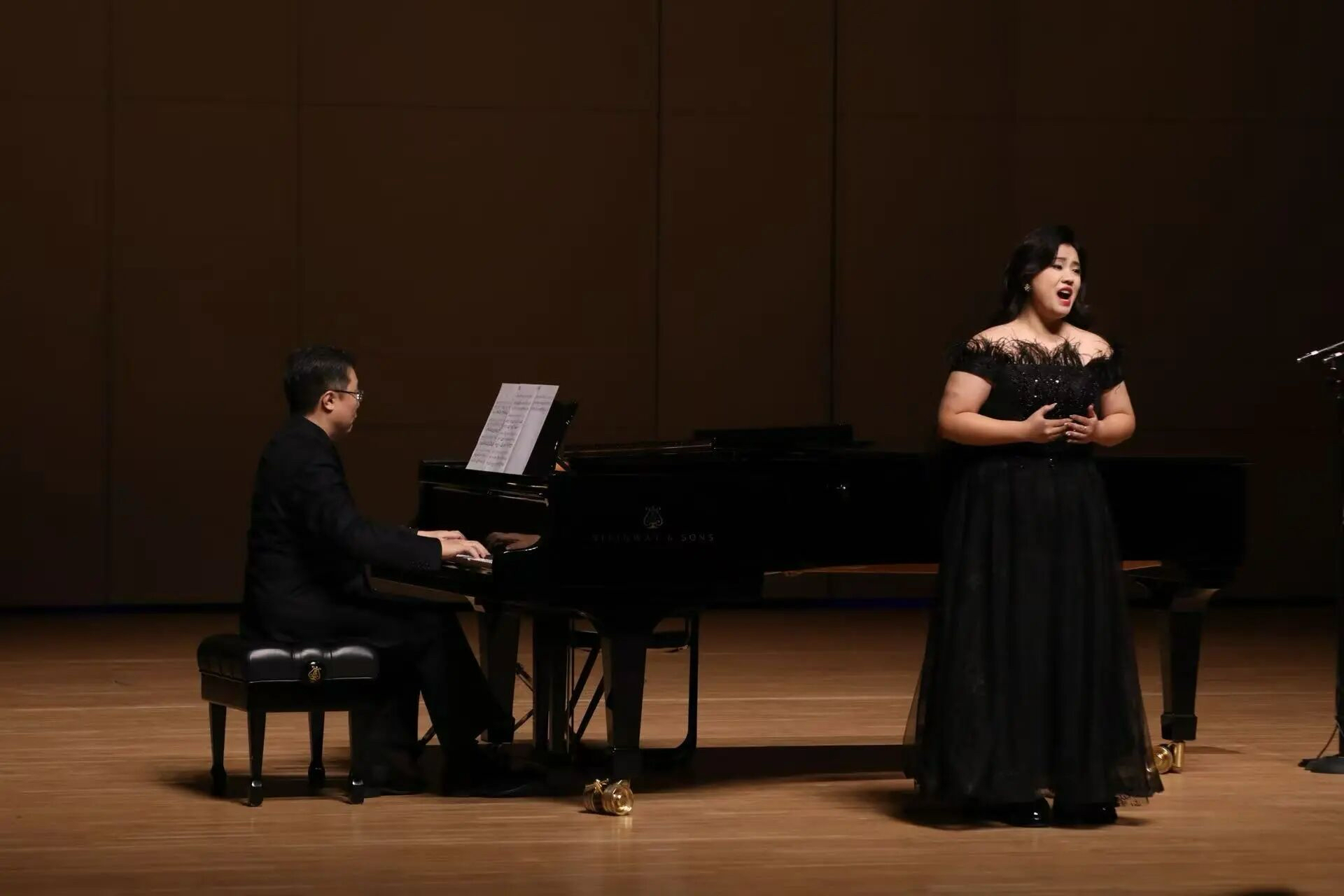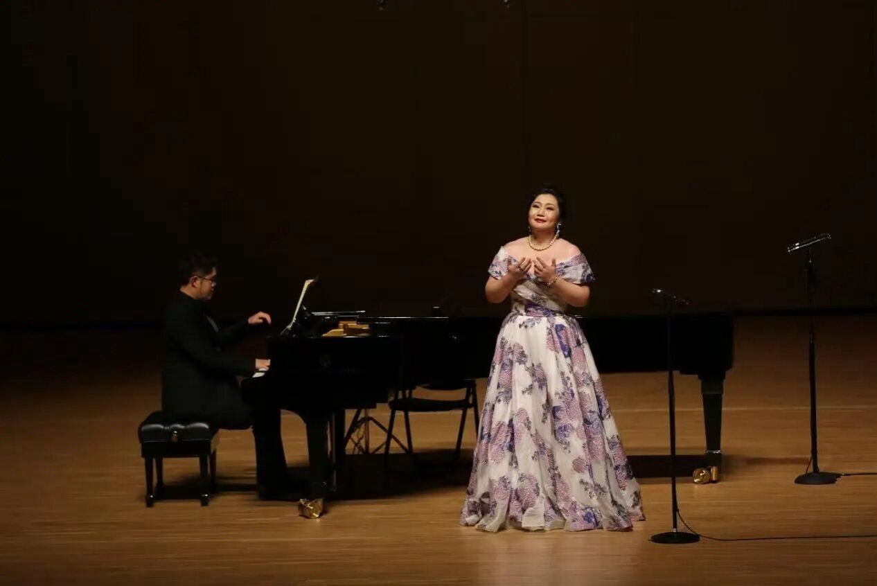 第三部分的曲目聚焦歌剧经典,于萍丽老师与阿尔方索・阿玛多老师合作演绎《五年前你说你爱我》(选自歌剧《夏日彩虹》,原名《山村女教师》),她以精湛的声乐技巧与饱满的情感张力,细细描摹歌剧角色的内心世界,既散发着成熟歌唱家的艺术芬芳,也映见了迪里拜尔教授“传艺育人”的丰硕之果。
