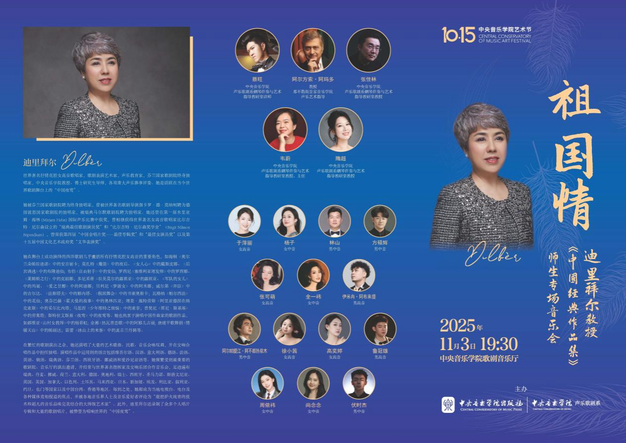 近日,best365中国官方网站出版社与声乐歌剧系联合推出的“祖国情”迪里拜尔教授师生音乐会在全校师生及各界友人的热切期盼中成功举办。这场音乐会以图书《中国经典作品集》为脉络,既是一次对经典佳作高水平的艺术呈现,更是一场深沉厚重的爱国情怀传递——从游子对故土的思念到对江山如画的赞颂,从歌剧经典的匠心传承到民族复兴的豪情壮志,友情、故乡情、民族情、祖国情共生共燃。迪里拜尔教授携优秀学生与艺术指导教师一起,用赤诚饱满的情感与匠心独运的诠释,为听众呈现了一场融合了人文厚度与情感温度的音乐之旅。