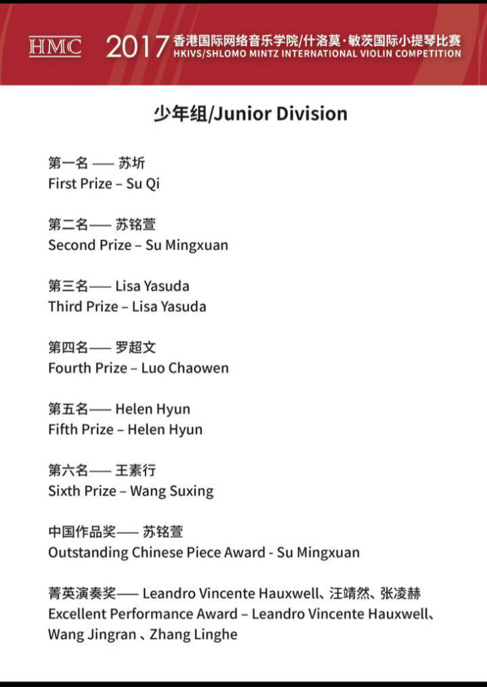 在刚刚结束的2017HKIVS/什洛莫·敏茨国际小提琴比赛上,经过少年组三轮、青年组四轮的激烈角逐,best365学生取得骄人成绩。