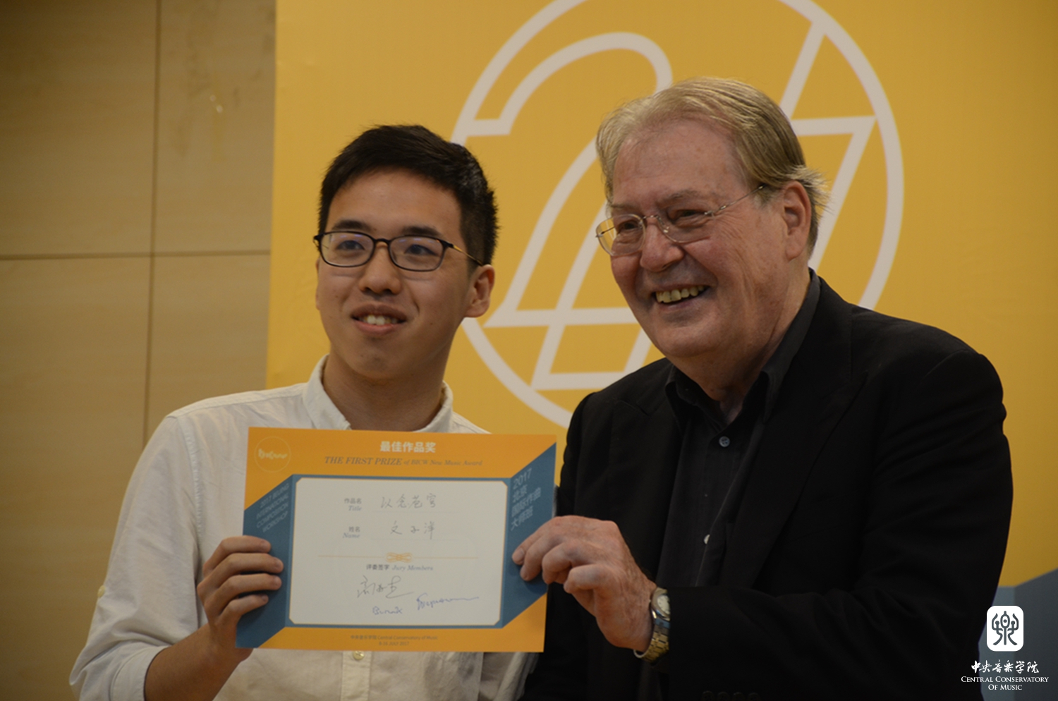 7月16日下午是大师班第二场作品音乐会,同时也是最重要的重头戏之A组学员作品音乐会。第七届北京国际作曲大师班A组学员共有八位,他们分别是陈宇晟、付文杰、李歌立、李景元、李诗媛、刘豫徽、王迥和文子洋(按姓氏拼音排序),自7月9日起,每位学员便开始了最终的作品修订完善,他们先后经历了作品的试奏与讨论(中西乐器首次合奏,讲座教授莅临现场并提出宝贵意见)、个别课(根据提到的问题与教授进行更细致的调整)、五次与乐团的高强度合练,最终锻造出最完整的音响"塑型"。八部作品结构完整、材料集中、技艺成熟、音色细腻,体现着年轻作曲家丰富的想象力与较强的写作功底。音乐会结束后,经过了各位任课教授长时间的细致评比,最终,文子洋的作品《以念苍穹》荣获了"最佳作品奖"、李诗媛的作品《桔梗愿》和付文杰的作品《魑魅魍魉》获得"优秀作品奖",此外,由陈宇晟作曲的《地球的心跳I》被特别选为九月份奥地利现代室内乐音乐节的专场曲目。