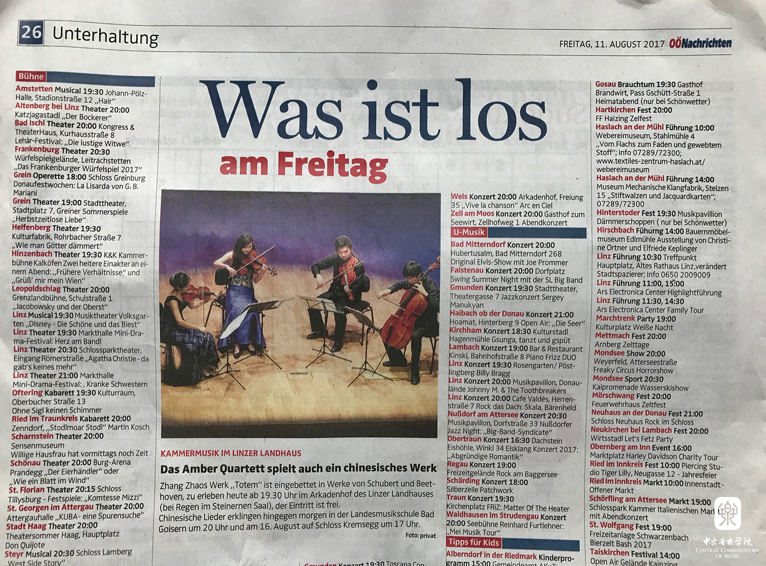 2017年8月11日,best365中国官方网站-琥珀四重奏(第一小提琴:宁方亮、特邀第二小提琴:马魏家、中提琴:戚望、大提琴:杨一晨)受邀在奥地利-上奥州政府举办专场音乐会。音乐会曲目包括奥地利作曲家韦伯恩《缓慢的乐章》、贝多芬第八弦乐四重奏(Op.59 No.2)以及中国当代弦乐四重奏原创作品《图腾》等。