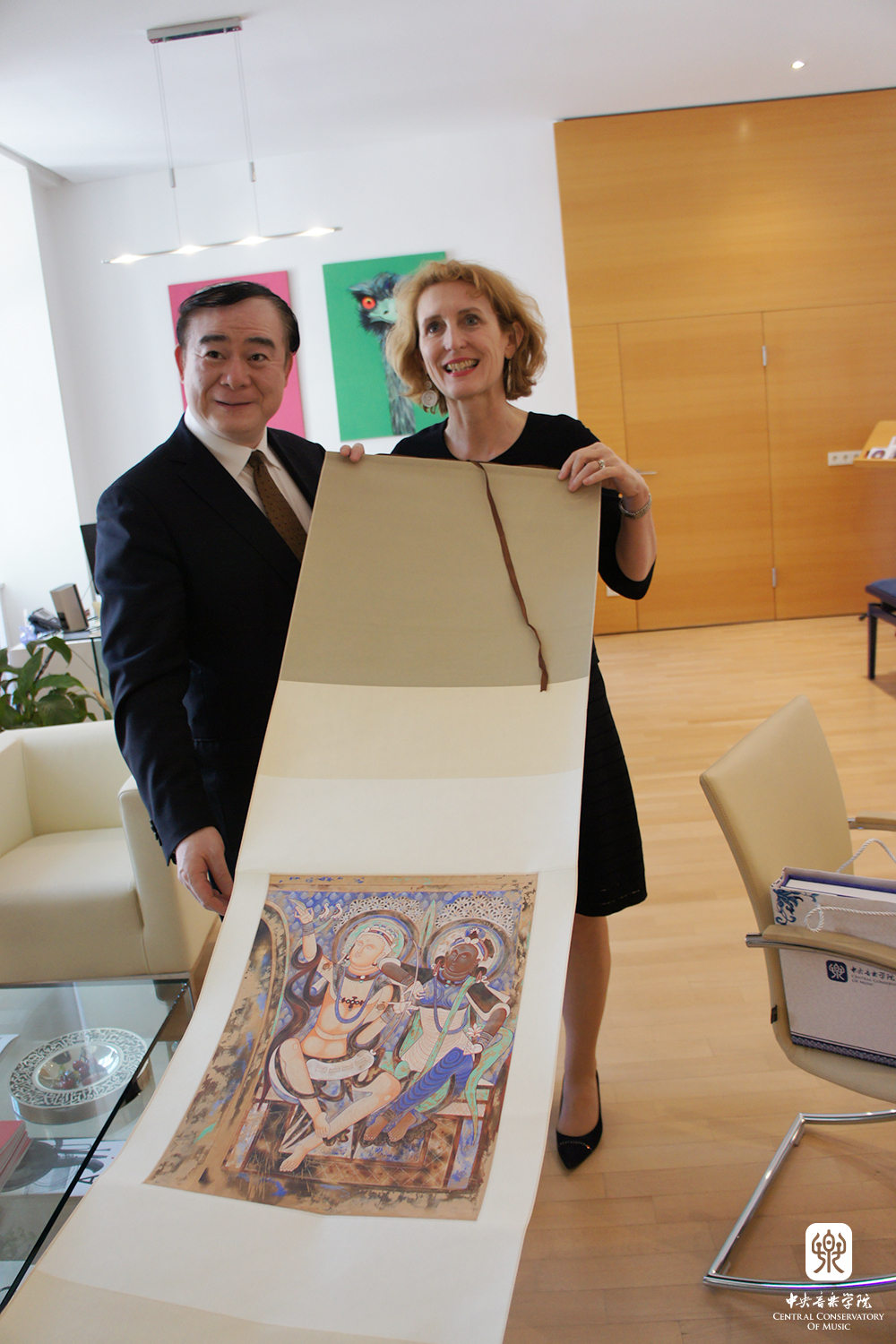 | 俞峰院长向维也纳音乐与表演艺术大学祖希校长赠送中国壁画纪念品 |