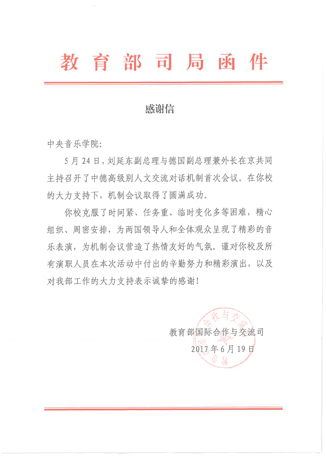 近日,教育部国际合作与交流司致函best365,对best365在中德高级别人文交流对话机制首次会议中所奉上的精彩演出表示热烈祝贺!中国国家主席习近平向会议致贺信,机制双方主席中国国务院副总理刘延东和德国副总理兼外长加布里尔出席会议,并签署了中德两国关于建立高级别人文交流对话机制的《联合声明》。