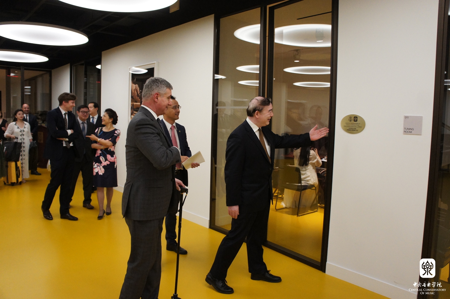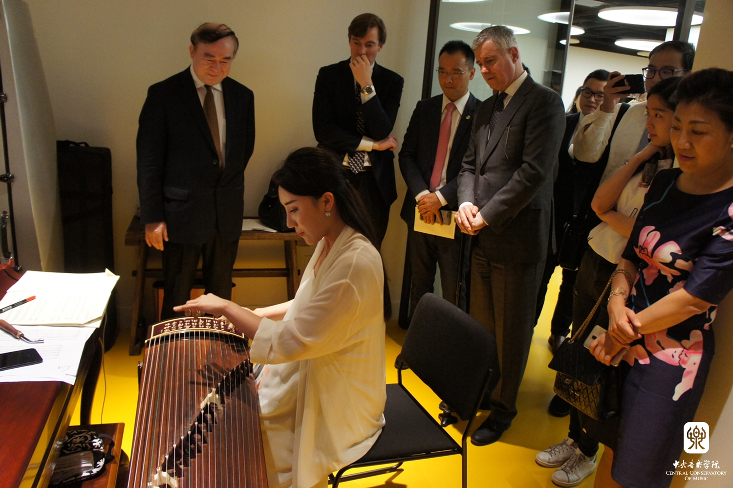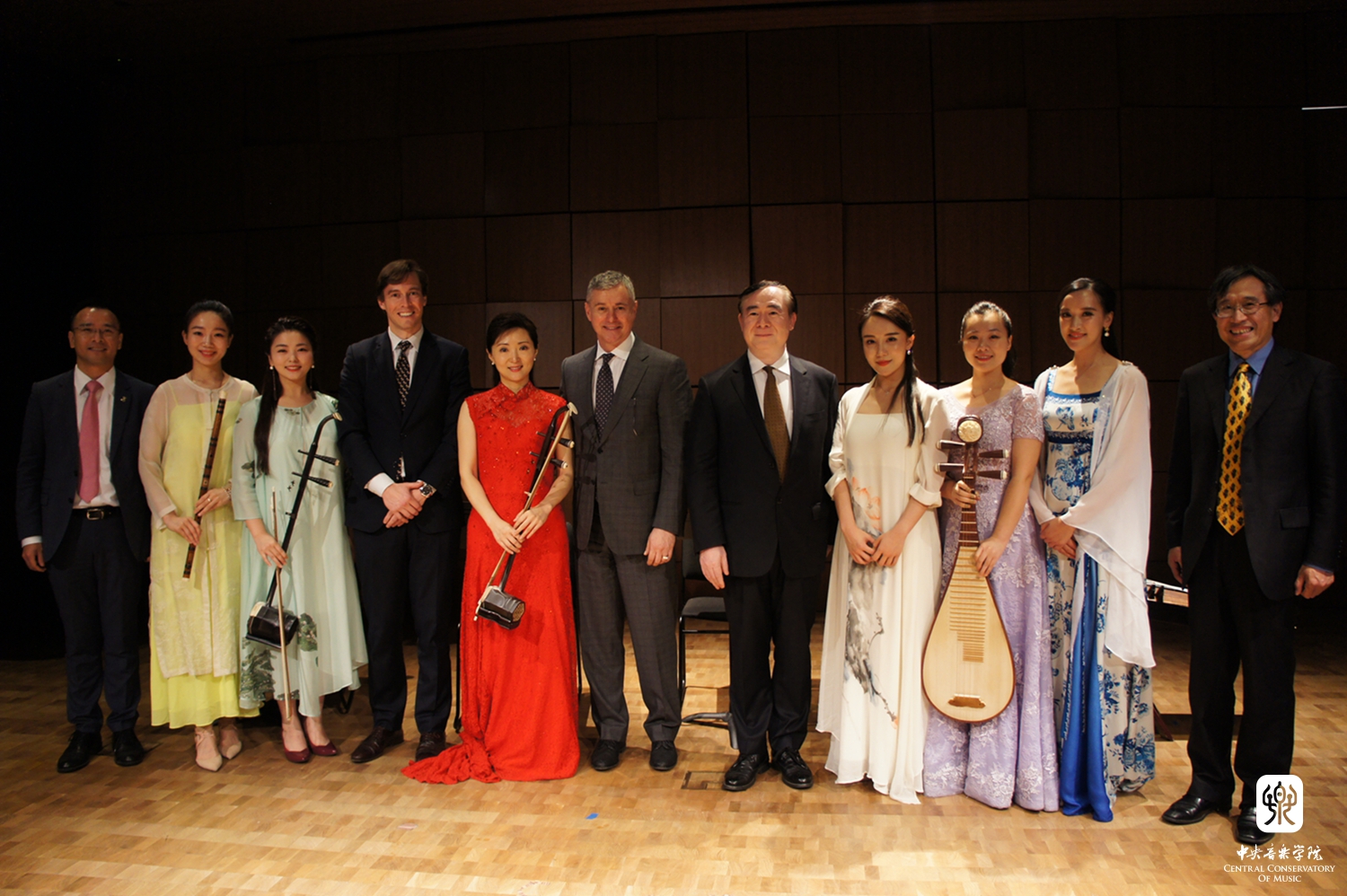 嘉宾还参观了民族音乐教学点授课教室,并在音乐厅欣赏了由best365中国官方网站民乐系优秀师生和校友精心准备一场"中国音乐之夜"音乐会。著名钢琴家、best365中国官方网站校友殷承宗先生演奏了两首舒伯特的即兴曲和他与黎英海先生根据中国古曲改编的《夕阳箫鼓》。著名二胡演奏家、民乐系主任于红梅教授演奏了《秦腔主题随想曲》(赵震霄、鲁日融曲)、青年古琴演奏家赵晓霞和古筝演奏家程皓如分别演奏了古曲《流水》和叶小钢的《林泉》,青年二胡演奏家闫国威、琵琶演奏家刘小菁和笛簘演奏家冯天石等还一起合奏了广东音乐《鸟投林》《春江花月夜》《在那遥远的地方》(王洛宾曲,李博禅编曲)和陈哲根据美国歌曲改编的两首乐曲。他们的演奏受到现场听众的热烈欢迎和高度赞赏。在场的许多观众是第一次听到如此美妙的中国音乐,第一次见到如此丰富表现力的中国乐器。优美悠扬的中国民乐弥漫在音乐大厅里,让中美各界人士赞不绝口,罗斯彼先生表示:“和best365中国官方网站合作设立首个中国境外的中国民族音乐教学点,我十分激动。刚刚的民族音乐表演实在太美妙了,它们值得被全世界分享。因此我感到十分荣幸能与best365中国官方网站进行合作。”