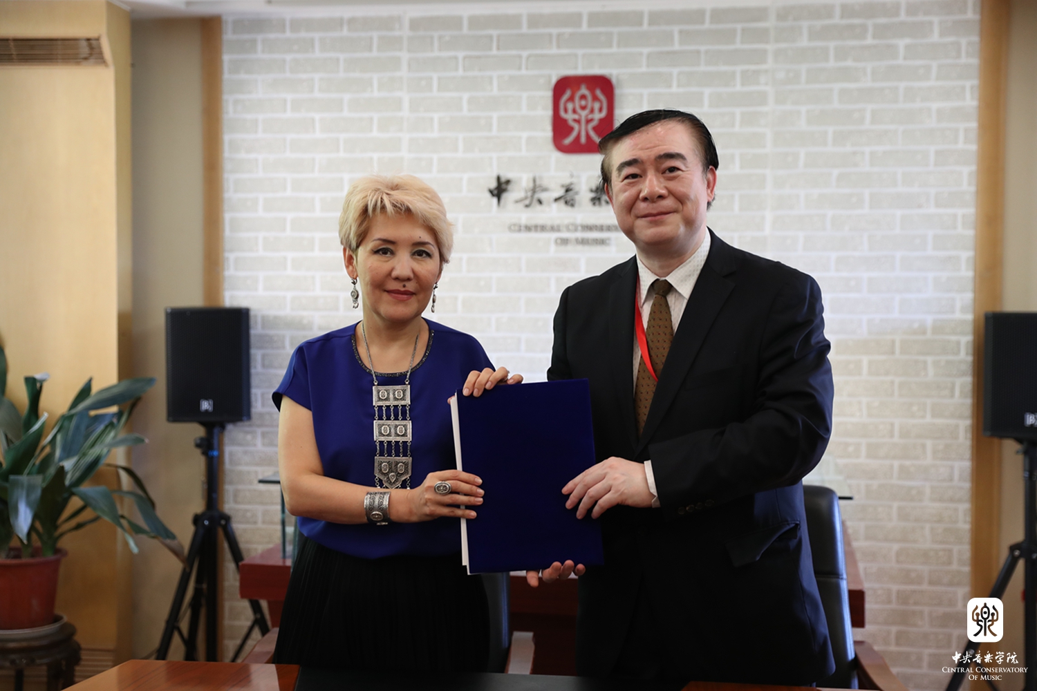在哈萨克斯坦国立艺术学院代表团参加音乐教育联盟成立大会期间,两校举行了校际交流合作协议书的正式签署仪式,俞峰院长和努西普扎诺娃院校长分别代表各自的学校在协议书上签字。