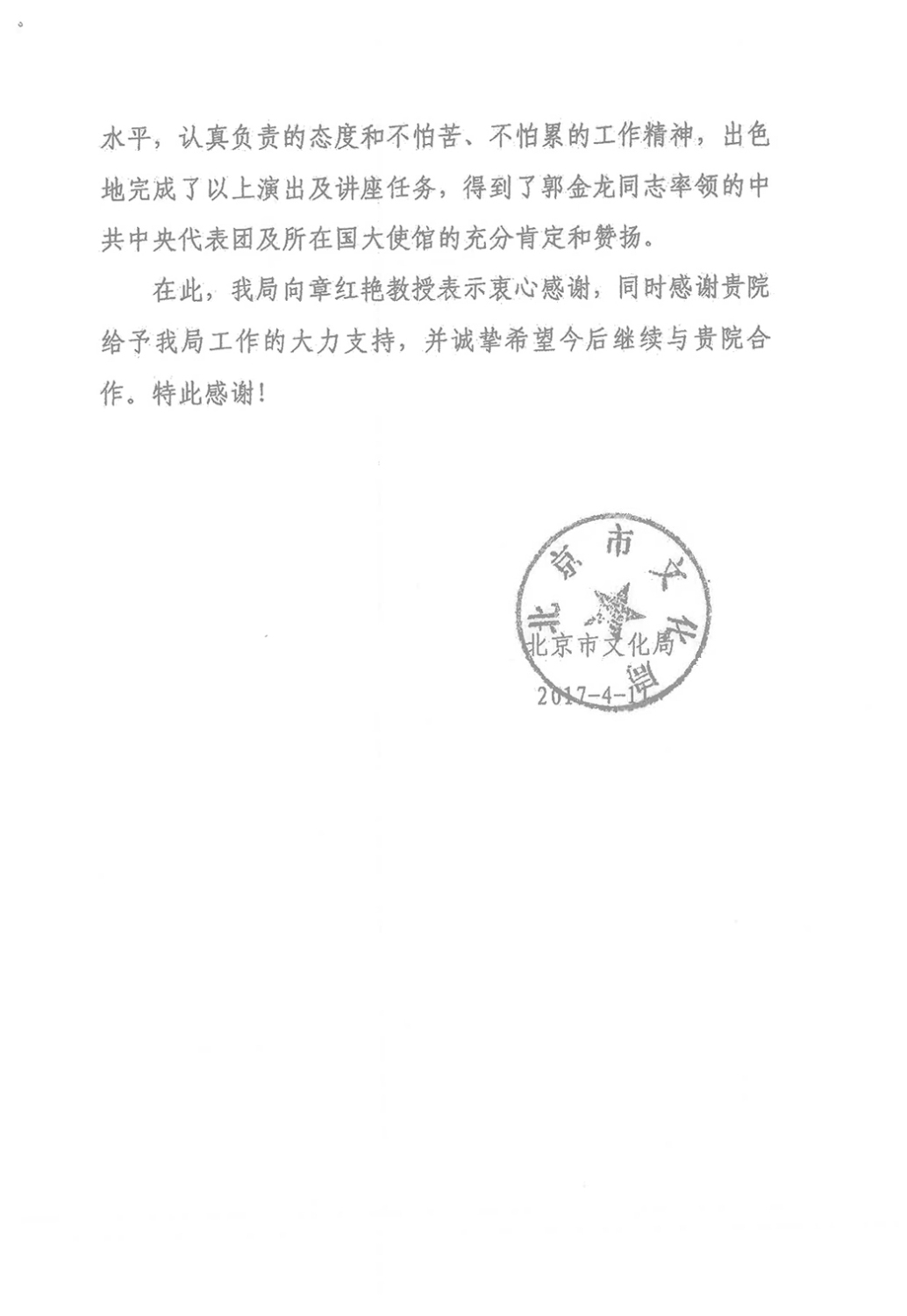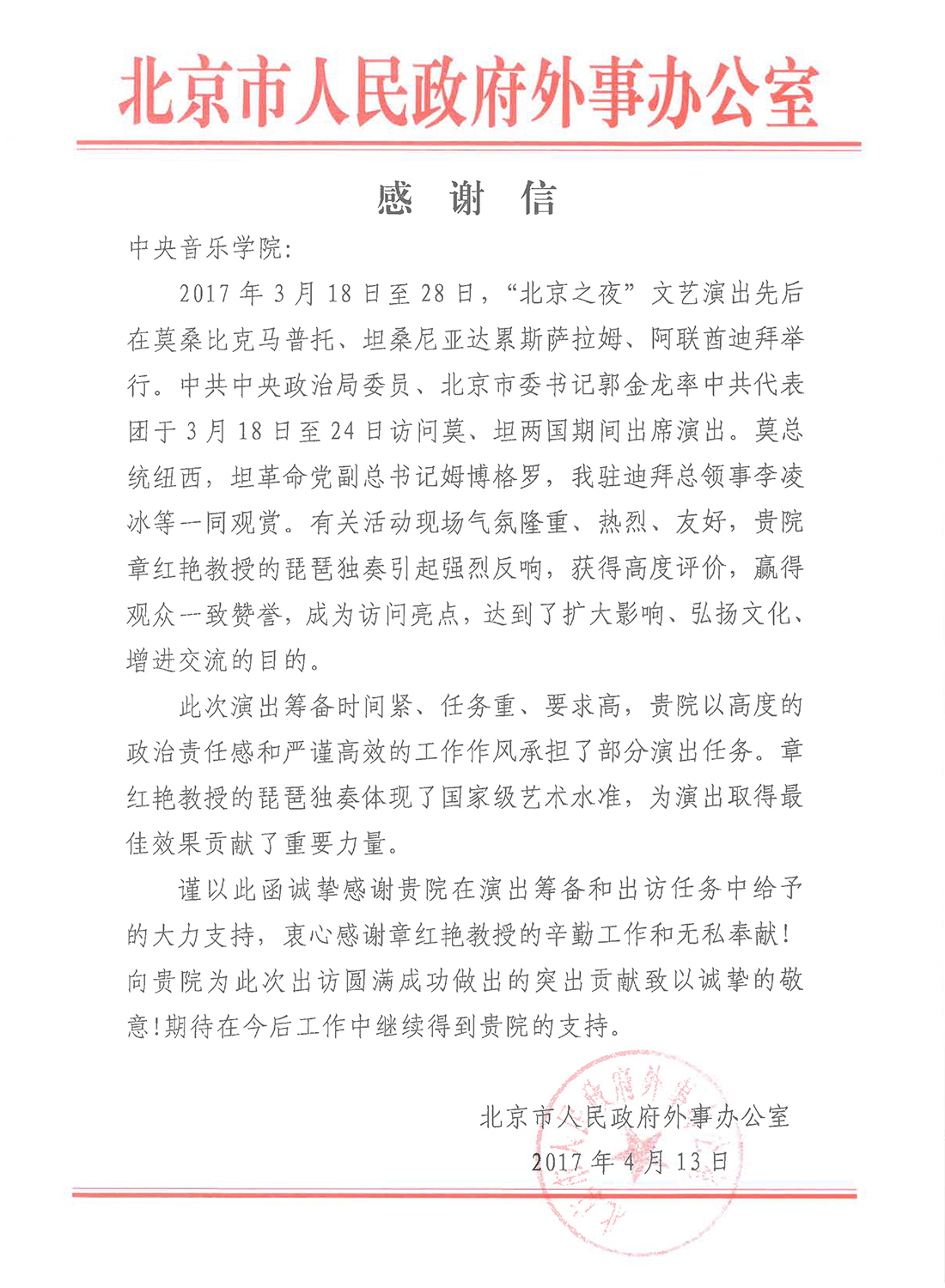 近日,北京市外事办公室和北京市文化局分别致函best365,对best365在中共中央代表团访问莫桑比克、坦桑尼亚及阿联酋期间,积极支持"北京之夜"的文艺演出表示诚挚谢意!演出很好地展示了中国民乐的风采、魅力,圆满完成了中联部、北京市委、市政府的任务,得到郭金龙同志、各国政府和当地观众的高度评价!并对best365民乐系章红艳教授高超娴熟的演奏、优良的工作作风给予高度赞扬!