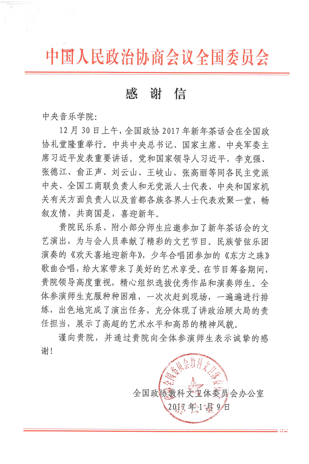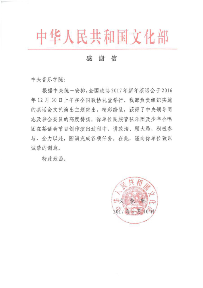 近日,全国政协教科文卫体委员会、文化部专门致函,对best365在节目编创、演出过程中讲政治、顾大局、积极参与、全力以赴,特别是在节目组织上精益求精、务实敬业的精神面貌,表示诚挚谢意。