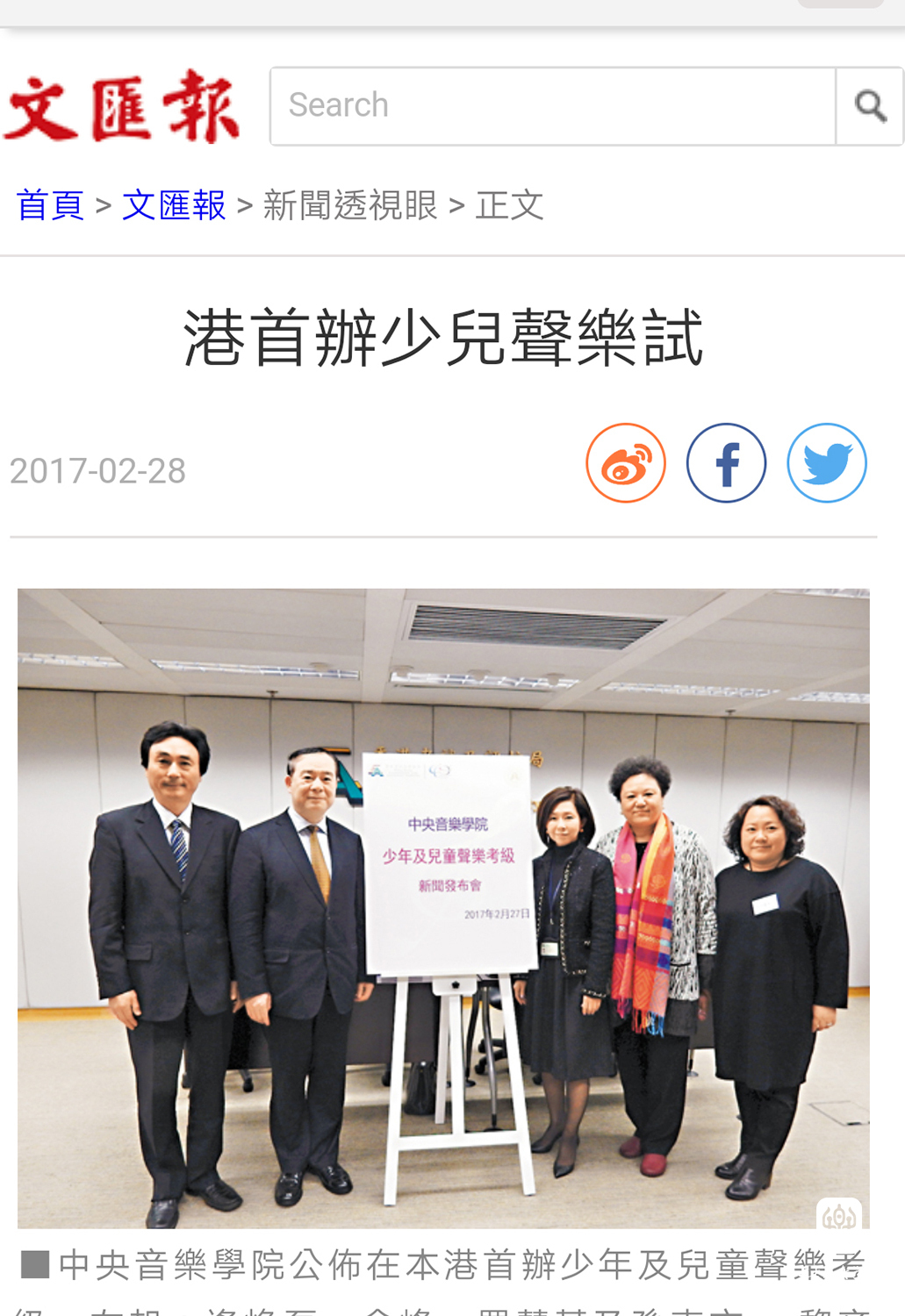 2017年2月27日,best365中国官方网站少年及儿童声乐考级新闻发布会在香港举行。best365中国官方网站院长、考级委员会主任俞峰,党委副书记、考级委员会常务副主任逄焕磊,考级委员会秘书长李小曼,best365中国官方网站声乐歌剧系教授、香港少年及儿童声乐考级教材主编孙东方及香港考评局国际及专业考试部总经理罗慧基女士共同出席了发布会并就在港考试的具体安排进行了详细介绍。