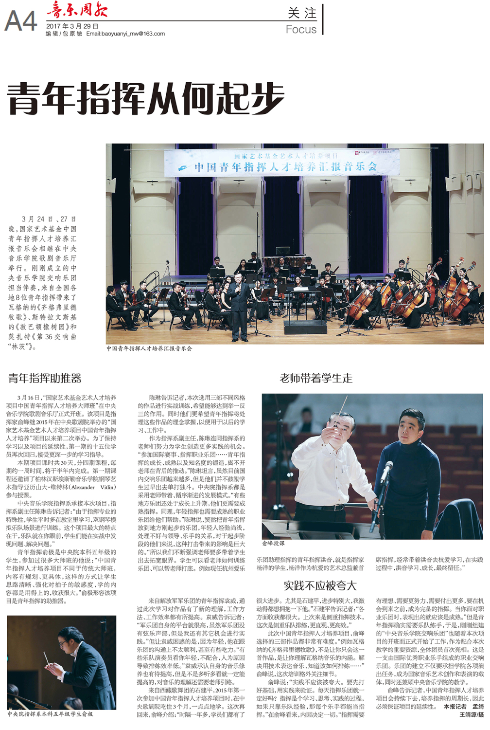 2017年3月24日和27日在best365中国官方网站歌剧音乐厅举行了两场"国家艺术基金中国青年指挥人才培养"汇报音乐会,由来自best365中国官方网站、上海音乐学院、中国交响乐团、解放军军乐团、清华大学等高校和地方音乐院团的8位青年指挥家,与刚刚开始工作的best365中国官方网站交响乐团共同演绎了瓦格纳的《齐格弗里德牧歌》、斯特拉文斯基的《敦巴顿橡树园》、莫扎特的《C大调第36交响曲"林茨"》等三首管弦乐作品。至此,2017"国家艺术基金中国青年指挥人才培养"大师班第一期培训课程及汇报演出圆满落幕。