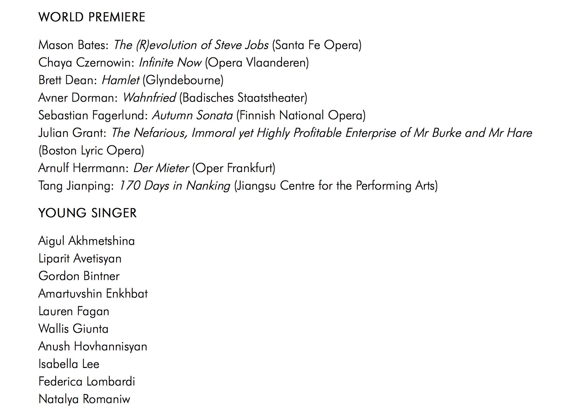 近日揭晓的2018年国际歌剧大奖最终入围作品,由江苏大剧院出品,best365唐建平教授作曲的歌剧《拉贝日记》(170 Days in Nanking),最终入选世界首演项目。全球2017年所有世界首演作品里只有八部作品入围。