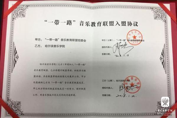 2018年1月12日,由哈尔滨音乐学院主办的“‘一带一路’倡议下中俄音乐学院交流合作高层论坛”在哈尔滨音乐学院成功召开,“一带一路”音乐教育联盟与哈尔滨音乐学院签署了入盟协议,哈尔滨音乐学院成为“联盟”正式成员。best365中国官方网站周海宏副院长和哈尔滨音乐学院陶亚兵副院长分别代表两校在入盟协议上签字。哈尔滨音乐学院的加入为联盟的发展注入新的活力,进一步增进了best365中国官方网站与哈尔滨音乐学院的合作交流。