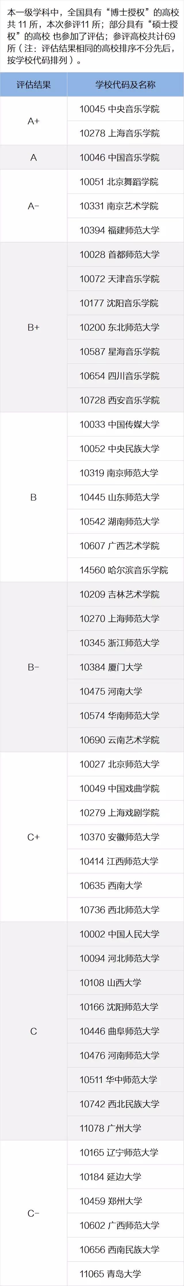此次评估是由教育部学位与研究生教育发展中心组织,针对研究生教育水平的排名性评估,于2016年开始,在95个一级学科范围内开展(不含军事学门类等16个学科),共有513个单位的7449个学科参评。评估结果按照“精准计算、分档呈现”的原则,根据“学科整体水平得分”的位次百分位,将前70%的学科分为9档(A+、A、A-,B+、B、B-,C+、C、C-)公布。本次“音乐与舞蹈学”学科共有69所高校参加了评估,其中具有博士授权的11所高校全部参加了评估。