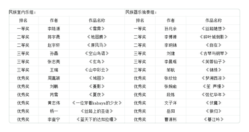 第三届中国民族音乐节暨“学院奖”民乐作品评选活动于12月初落下帷幕。此次评选分为“民族室内乐”和”民族器乐独奏”两类,自章程公布之日起,共收到来自全国各地的作品共计71部(独奏38部,重奏33部)。初评采取评委集中审阅总谱、现场聆听音频、各自打分的方式,分别遴选出独奏作品18部和室内乐作品12部。两组晋级作品于12月1日(民族室内乐组)和2日(民族器乐独奏组)在王府音乐厅进行了决赛,经过两晚近八小时的角逐,最终产生了各组一、二、三等奖及优秀奖。结果如下: