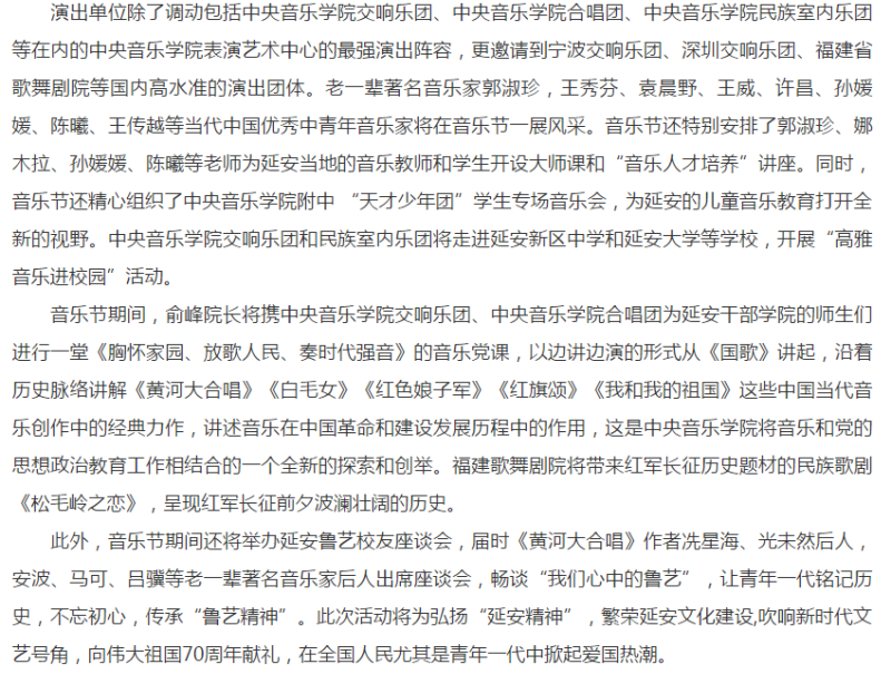 音乐节将于5月23日在革命圣地——延安开幕,持续至27日。5月23日晚的开幕式音乐会——“致敬祖国暨纪念《黄河大合唱》创作80周年”音乐会,将由教育部体卫艺司、文化和旅游部艺术司加盟主办。