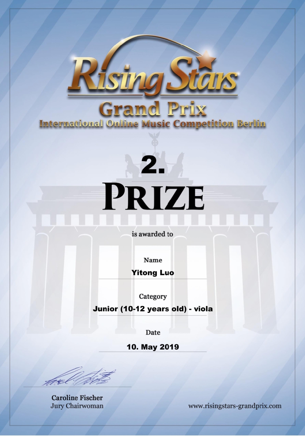 The 4. Rising Stars Grand Prix 2019 International online Music Competition Berlin是在世界范围内,通过在线提交演奏视频的方式来评比的。此比赛是包括弦乐,管乐,钢琴,打击乐等各个专业的综合性比赛。罗怡彤是少年组唯一以中提琴比赛获奖的选手。