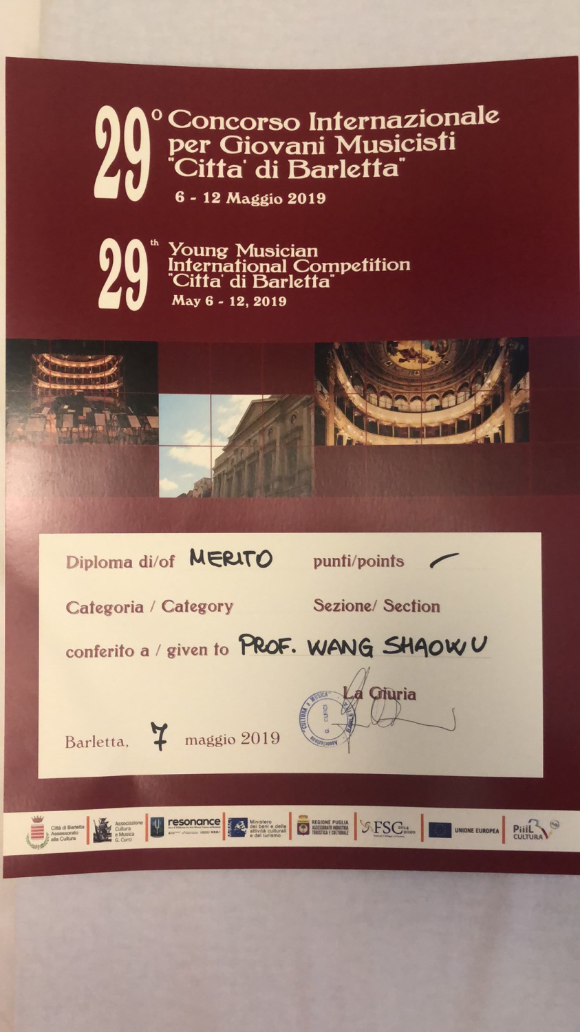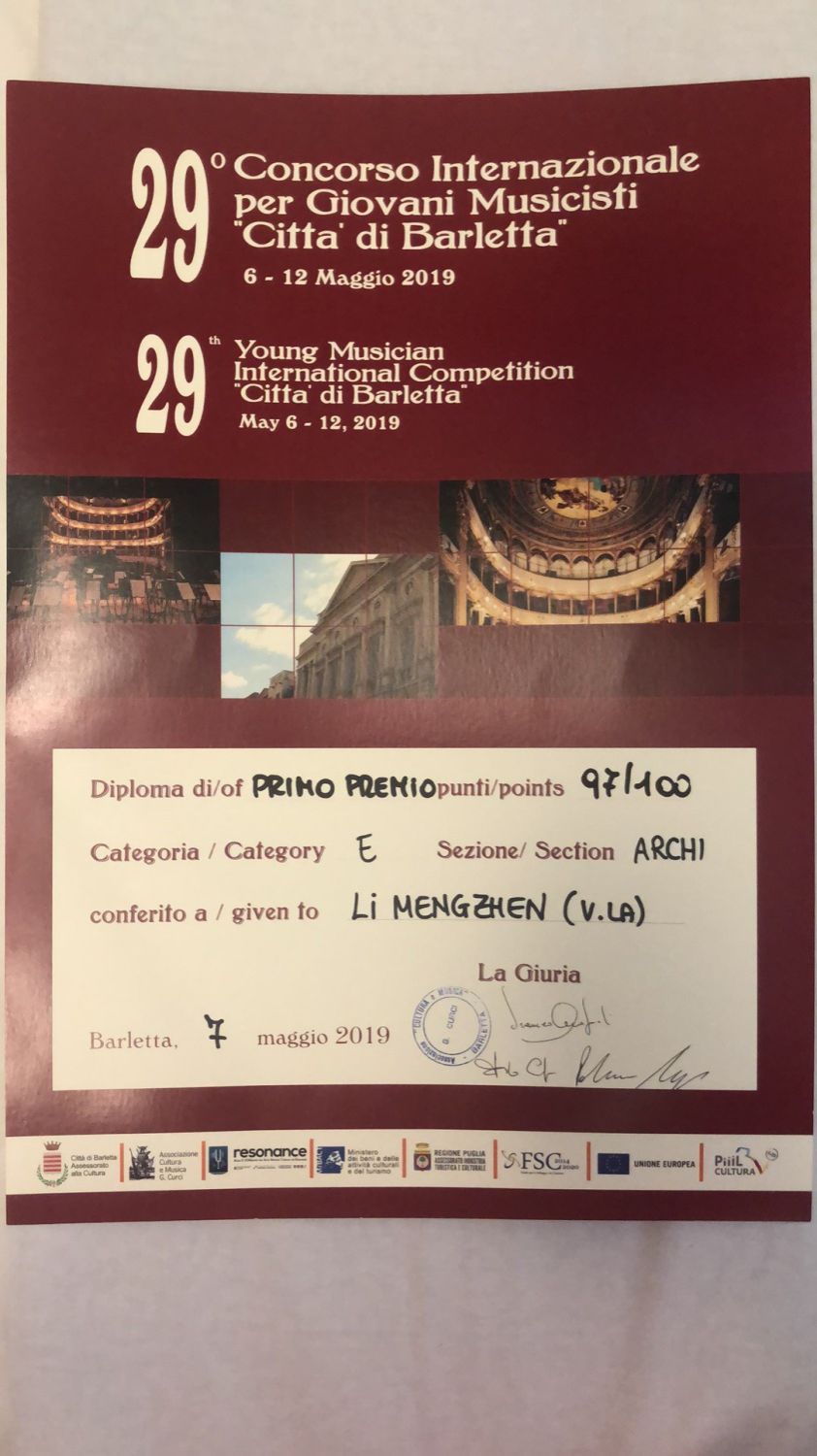 在2019年5月6日-5月12日,第二十九届意大利青年国际音乐比赛“Città di Barletta”弦乐比赛中best365管弦系研究生李孟真荣获青年组第一名,指导教师王绍武教授获得最佳指导教师奖。