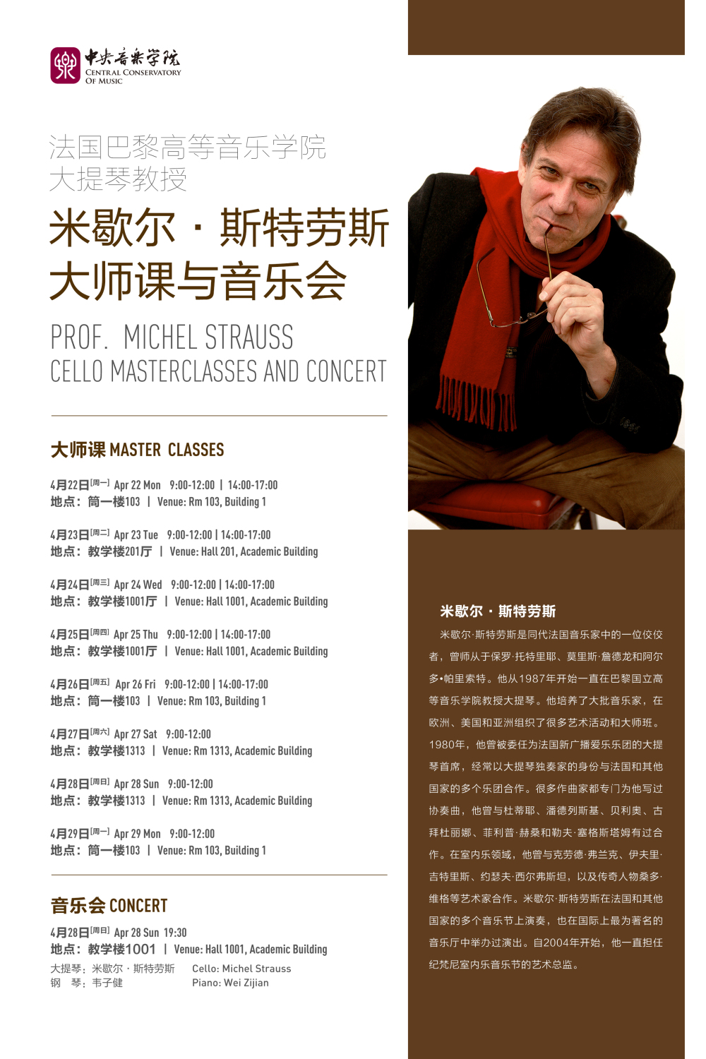 米歇尔·斯特劳斯是同代法国音乐家中的一位佼佼者,曾师从于保罗·托特里耶、莫里斯·詹德龙和阿尔多•帕里索特。他从1987年开始一直在巴黎国立高等音乐学院教授大提琴。他培养了大批音乐家,在欧洲、美国和亚洲组织了很多艺术活动和大师班。1980年,他曾被委任为法国新广播爱乐乐团的大提琴首席,经常以大提琴独奏家的身份与法国和其他国家的多个乐团合作。很多作曲家都专门为他写过协奏曲,他曾与杜蒂耶、潘德列斯基、贝利奥、古拜杜丽娜、菲利普·赫桑和勒夫·塞格斯塔姆有过合作。在室内乐领域,他曾与克劳德·弗兰克、伊夫里·吉特里斯、约瑟夫·西尔弗斯坦,以及传奇人物桑多·维格等艺术家合作。米歇尔·斯特劳斯在法国和其他国家的多个音乐节上演奏,也在国际上最为著名的音乐厅中举办过演出。自2004年开始,他一直担任纪梵尼室内乐音乐节的艺术总监。
