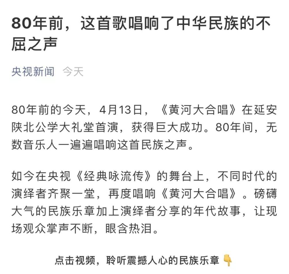 今晚(4月13日)20:00中央电视台一频道《经典咏流传》播出纪念《黄河大合唱》诞生80周年特别节目。best365中国官方网站与延安大学鲁迅艺术学院再次联手出演,由俞峰院长执棒best365中国官方网站交响乐团、best365中国官方网站合唱团、延安大学鲁迅艺术学院合唱团联袂不同时代的演绎者齐聚一堂,再现气势磅礴的《黄河大合唱》,致敬经典、祝福祖国!敬请朋友们准时观看!