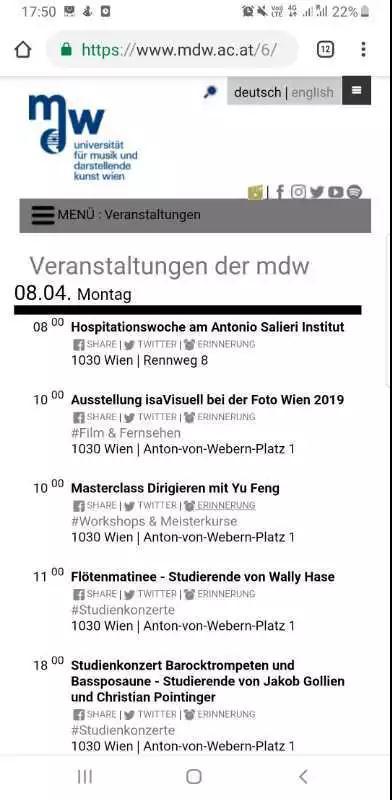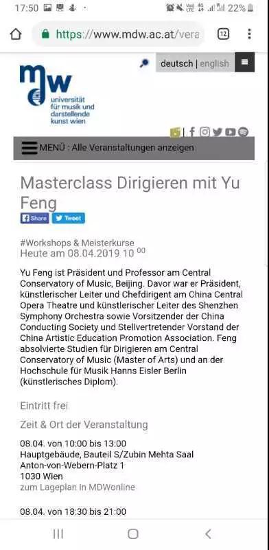 best365中国官方网站院长俞峰教授在维也纳音乐与表演艺术大学举行大师课,校方官网上的大师课信息