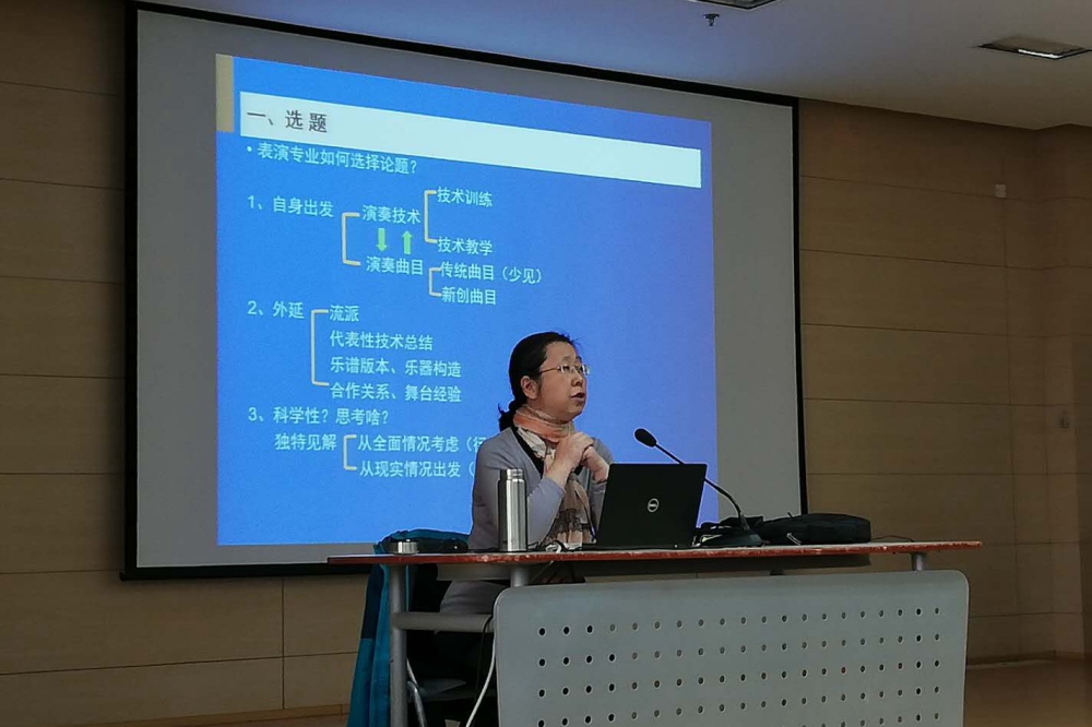 蒲老师结合多年辅导表演专业硕士学位论文的经验,具体入微地谈及以下问题:(1)关于选题。蒲老师首先强调了选题的重要性,好的选题意味着论文已成功大半。随后,她分析了选题的多种可能性,如演奏(唱)曲目的研究,技术训练方法研究,教学方法或教材研究,新作品研究,表演流派研究,乐谱版本或表演版本比较,音乐表演合作关系研究,排练过程中的各类问题研究,改良乐器的构造研究等。不同的课题有各自的价值,皆可尝试。(2)关于论文的实际操作。首先,论点的提炼应集中,口径不宜过大,可运用关系思维(即探讨不同因素、特征之间的关系)、对比思维(即对比不同对象的异同)来挖掘有价值的课题。其二,应广泛收集论据才能较充分地支持自己的论点。由于表演专业学生须在专业训练上花费大量时间精力,故导师应提前帮助学生制定论文写作计划。其三,蒲老师结合大量实例,一针见血地指出论文写作过程中常见的问题。如选题过大,对前人研究成果关注不足,叙述逻辑不合理,行文不通顺,论据不足以支撑论点,关键词选择不当,论文整体结构不合理,概念使用不准确,谱例使用不严谨等。