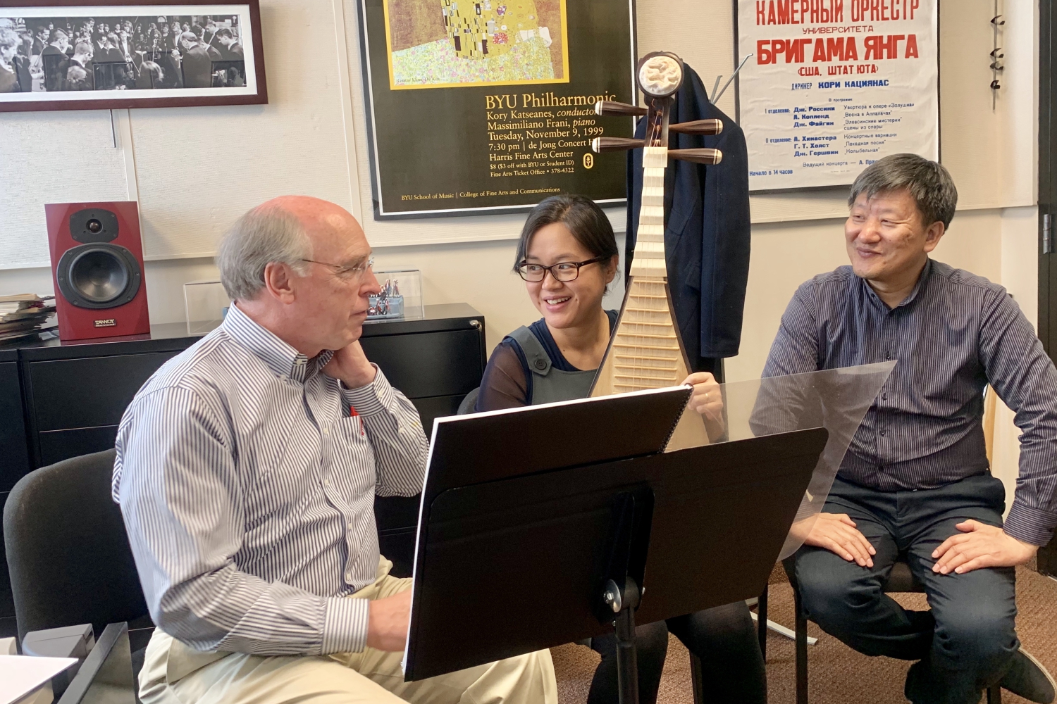 音乐会和排练之余,贾国平教授、林涛教授分别做了“《风越苍茫》中的配器观念和技术分析” 、“《聆籁》的结构分析以及音响与自然的美学关联” 和“俄罗斯指挥学派”等学术讲座,并针对作曲和指挥专业的本科生、研究生进行了大师班授课;兰维薇副教授则面向“世界音乐”课堂,边讲边弹地为师生们带去了生动的“琵琶音乐的风格和语言”专题,并针对两位作曲专业学生为琵琶而写的习作进行了工作坊式的视奏和录音,亦在两场正式音乐会之余受邀为BYU学生的午间音乐会做嘉宾演奏;代博老师则介绍了自己近年来的创作成果,还与作曲专业的学生进行了深度的交流。