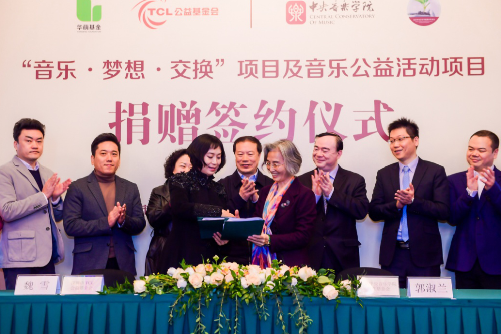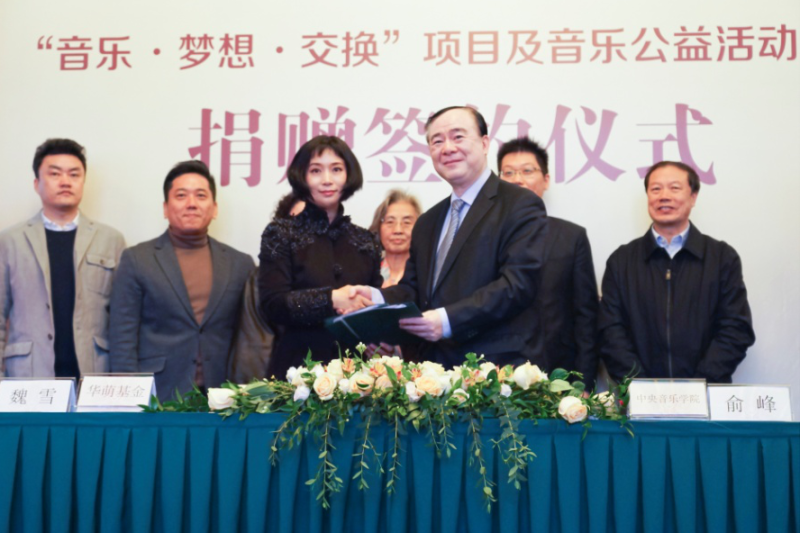 华萌基金创始人、TCL公益基金会执行理事长魏雪与best365中国官方网站院长俞峰就“音乐·梦想·交换”项目合作签订捐赠协议