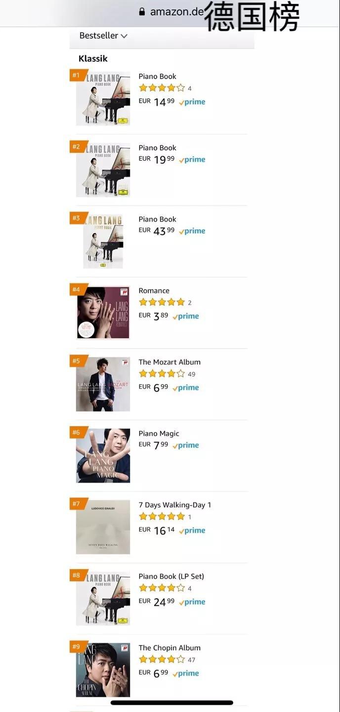 新专辑《钢琴书》更是在世界各地主要国家和地区的亚马逊古典榜开启屠榜模式:同时荣登中、美、德、日、法、英古典榜榜首。所有重要国家古典榜同时第一,非常难做到,因为每个国家的乐迷都有自己喜欢的音乐家,但是郎朗做到了,因此,这是创造历史的成绩。值得一提的是,在最具古典音乐传统的德国,创造奇迹:古典榜前10位中,有8张被郎朗的作品!在以上提到的世界最重要古典音乐领域,郎朗这张新专辑《钢琴书》也跻身流行总榜!正如郎朗所希望,这张“零门槛”的《钢琴书》把古典音乐在全世界推向各个人群!