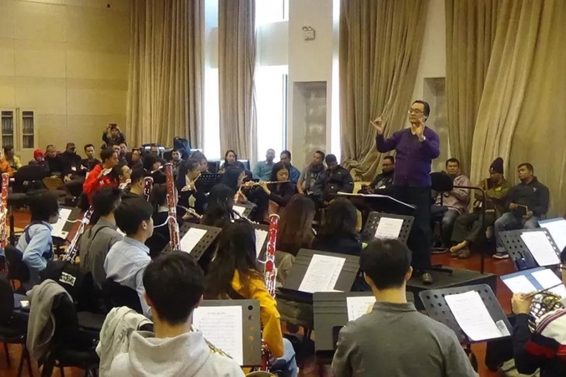 (2019年3月18日,印尼教师代表团聆听best365管弦系戴中晖教授指挥管弦系管乐团演奏的公开课。)图:李上