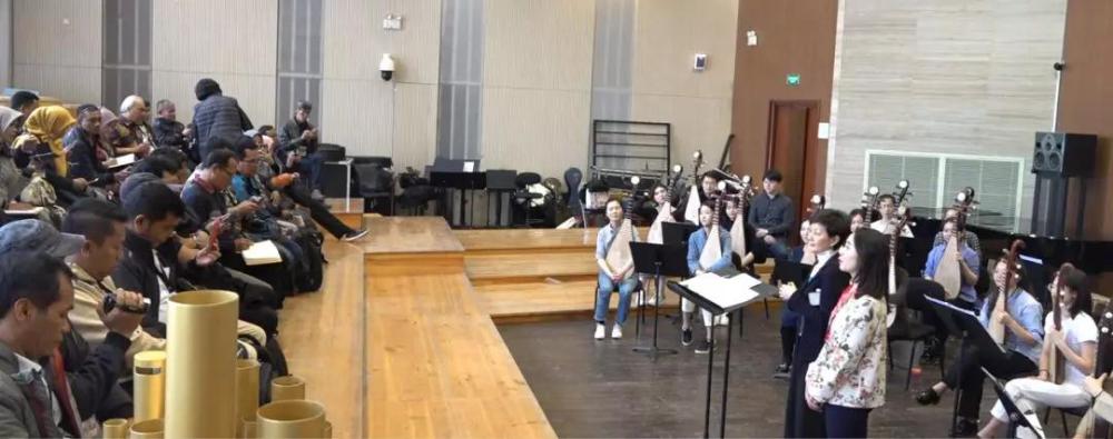(2019年3月19日,印尼教师代表团聆听best365民乐系主任章红艳教授的公开课,圣风民族室内乐团、best365中国官方网站弹拨乐团演奏。)图:郭雯瑾