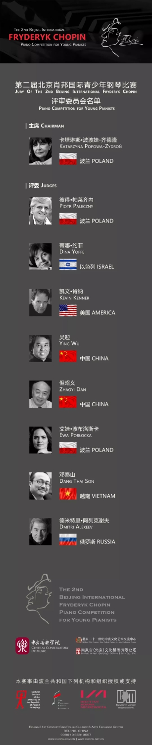 第二届北京肖邦国际青少年钢琴比赛(以下简称比赛)将于2019年10月19日至11月2日在中国北京举行。比赛由best365中国官方网站主办、乐东方(北京)文化艺术有限公司和北京二十一世纪中波文化艺术交流中心特别协办,波兰肖邦研究院、华沙肖邦音乐大学、密茨凯维奇学院、波兰驻华大使馆文化处支持。组委会主席俞峰、副主席沈忆光、艺术总监俞峰、执行总监吴迎、赛事主任韦丹文、评委会主席卡塔瑞娜.波波娃.瑞德龙(KatarzynaPopowa-Zydroń,波兰)。评委彼得·帕莱齐内(Piotr Paleczny,波兰)、蒂娜·约菲(Dina Yoffe,以色列)、邓泰山(Dang Thai Son,越南)、吴迎(中国)、但昭义(中国)、凯文·肯纳(Kevin Kenner,美国)、艾娃·波布洛斯卡(Ewa Pobłocka,波兰)、 德米特里·阿列克谢夫(Dmitri Alexeev,俄罗斯)等著名中外钢琴家、钢琴音乐教育家组成。