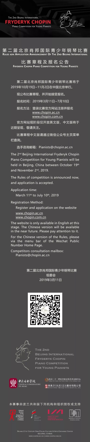 1. 报名请登录www.chopin.ac.cn或www.chopin.com.cn注册,并填写报名表,报名时间为2019年3月11日至2019年7月10日。