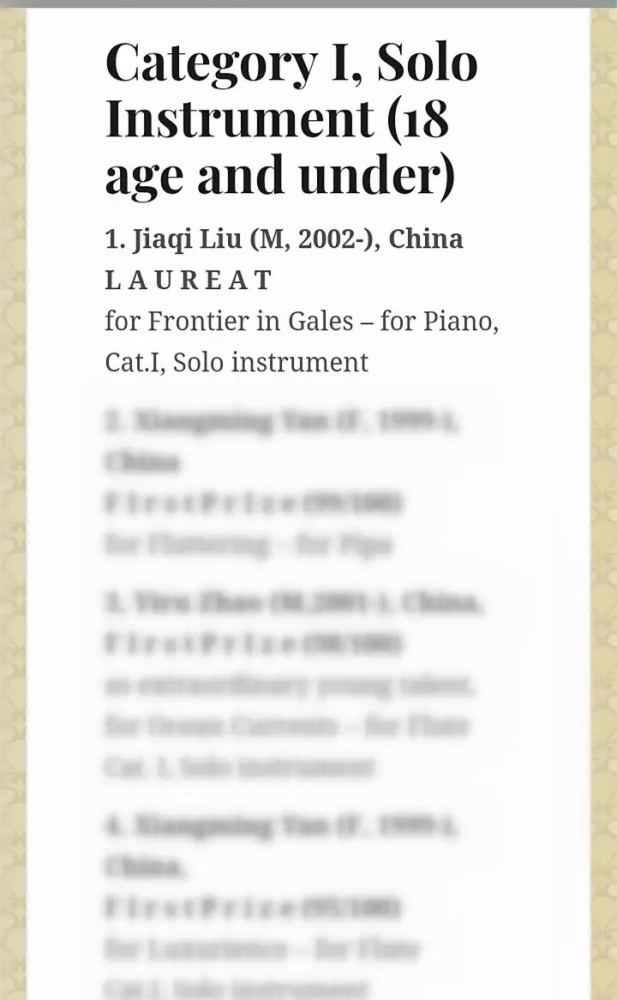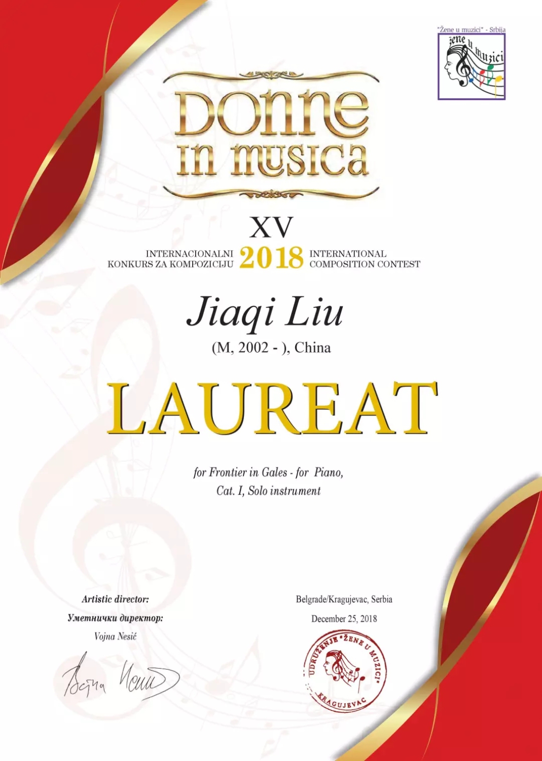 附中作曲专业高一年级刘佳骐(指导教师:刘长远教授)创作的钢琴独奏作品Frontier in Gales (边塞烈风)在2019年2月公布的第十五届塞尔维亚邓恩音乐国际作曲比赛(Donne in Musica International Composition Contest )成绩中荣获18岁及以下独奏乐器组LAUREAT(冠军)奖,这是本届赛事的最高奖。来自中国、塞尔维亚、阿塞拜疆、波兰、约旦、意大利、乌克兰等十几个国家的青年作曲者作品参加了比赛。这项自2003年开始的每年一届的传统赛事由阿德金斯・吉蒂基金会荣誉委员会(Honor Committee of Foundation Adkins Chiti)的成员Donne in Musica主办,向全球作曲者开放。 作品Frontier in Gales完成于2017年12月,烘托和描写了远居边塞的人们与恶劣环境勇敢、顽强地抗争,在穷冬烈风中祈福家园来年丰收和边界永久和平的感人场景。音乐富有激情,不断变化的和声与不停息的高度活跃的华丽乐句以及各种段落创造出了一个戏剧性的和激动人心的发展和走向。