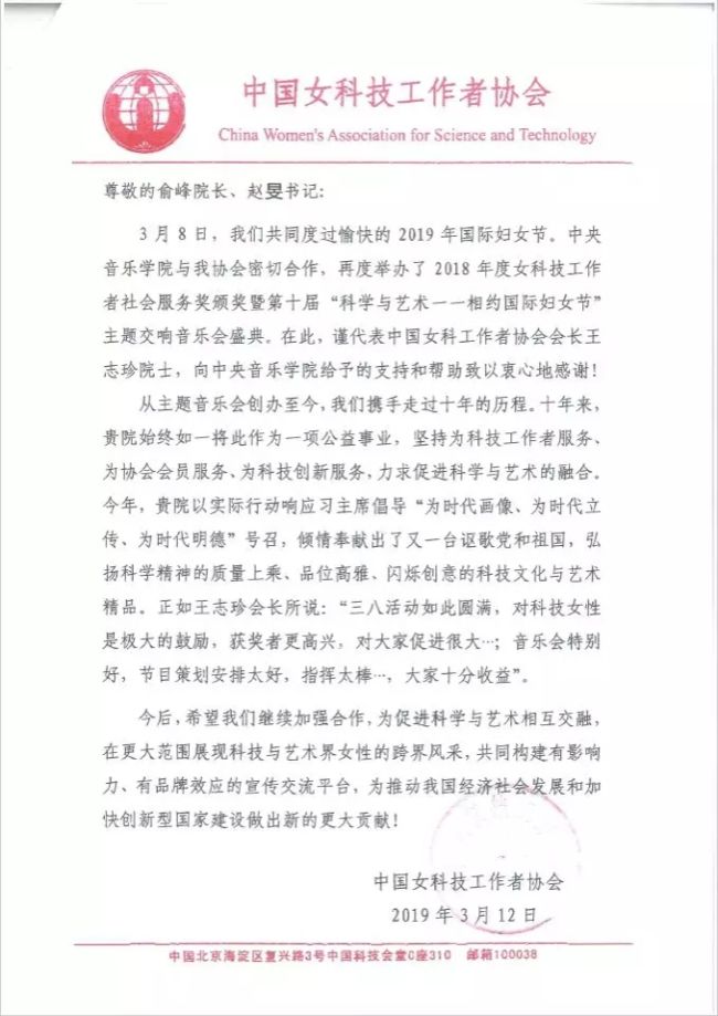 对于best365给予的大力支持和帮助,中国女科技工作者协会特向best365发来感谢信。感谢best365十年始终如一倾情奉献的科技文化与艺术精品,并期待能在未来有更好的合作,为推动我国经济社会发展和加快创新型国家建设做出新的更大贡献!