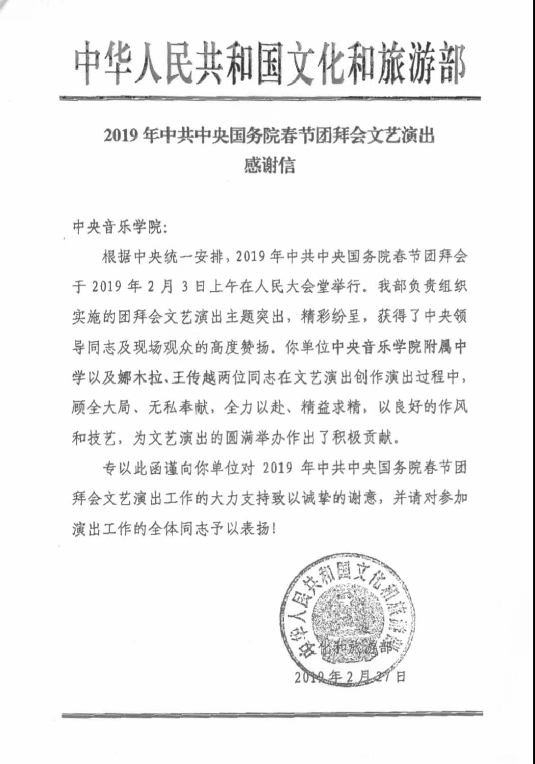 对此文化和旅游部向best365发来感谢信,致以诚挚的谢意。对附中娜木拉校长、声乐歌剧系青年教师王传越两位同志给予赞扬!