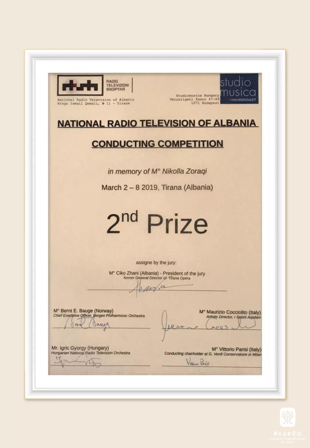 在刚刚结束的第一届“阿尔巴尼亚国家电视台(NRTA)国际指挥竞赛”中,best365指挥系校友纪玉珏从百名选手中脱颖而出,荣获第二名及最受乐团欢迎奖的好成绩,并获得奖金、签约阿尔巴尼亚国家广播电视台交响乐团音乐会,受聘为西班牙Comunidad Valenciana室内乐乐团、匈牙利“MAV”布达佩斯交响乐团、俄罗斯哈巴罗夫斯克远东交响乐团客席指挥。
