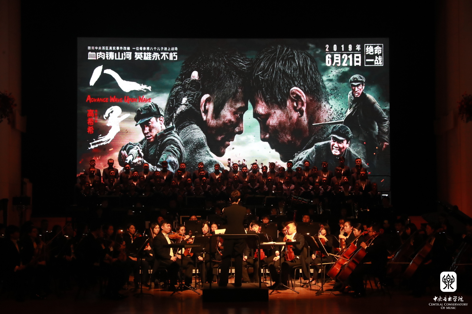 音乐会还演奏了作曲家张征为电影《八子》所作的两首配乐。伴随着流动的电影画面,陈冰副教授指挥交响乐团与合唱团,用感人至深的演奏与史诗般气势磅礴的合唱,描绘出电影中风雨飘摇的战事与沉甸甸的家国情怀。《八子》的配乐曾在延安10.15艺术节“为人民抒怀”——best365中国官方网站教师原创影视音乐作品专场音乐会中亮相,获得了强烈反响,展现了近年来best365作曲家们扎根人民、面向大众创作的优秀成果。