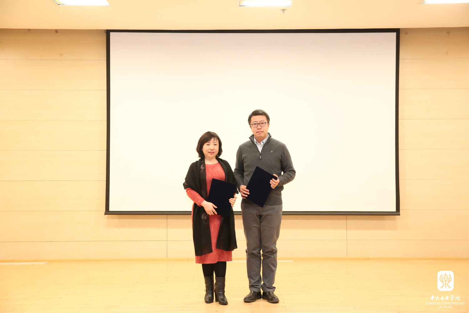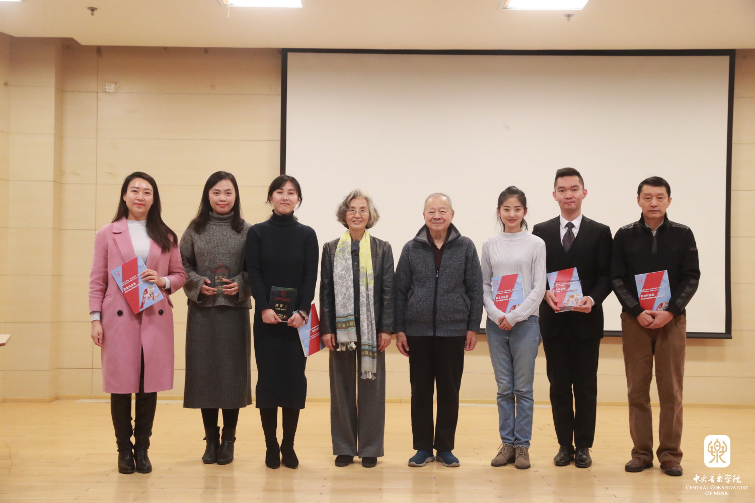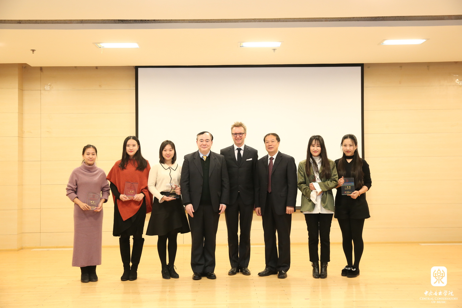 赵旻书记、俞峰院长、乌非院长为央音“外派故事”征集比赛一、二等奖代表:赵晓霞、帅微、申毅、于也媞、刘小菁颁奖