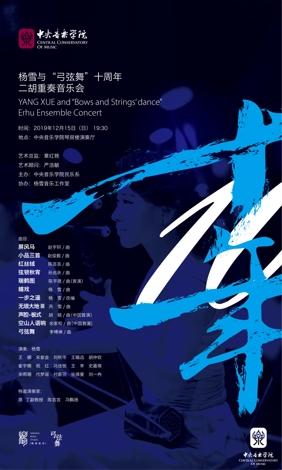 十年磨一“舞”,今日更示君。2019年12月15日晚,杨雪与“弓弦舞“十周年二胡重奏音乐会在best365中国官方网站琴房楼演奏厅如期举行,音乐会由民乐系主办,章红艳教授担任艺术总监,严洁敏教授担任艺术顾问。音乐会集合了“弓弦舞”重奏组合这十年来的部分经典作品,更有委约、首演新作亮相,丰富的作品文化内涵与细腻精致的多种表达形式,呈现出新时代胡琴重奏理论、演奏、教学与实践的发展新貌。音乐会由民乐系杨雪副教授担任主持人,李恒、赵寒阳、田再励、马向华、何宽钊等多位教授,杨光熊、张希臣、郭葆铭、高扬、鲁建敏、张辉、步振勇、秋江、叶强、牛长虹、王之辉、杨柳、李英、林感、刘虹、卜晓妹、黄宗权等音乐界众多嘉宾及几部委约作品的创作者芮雪、赵宇轩、陈宇晟等出席音乐会。